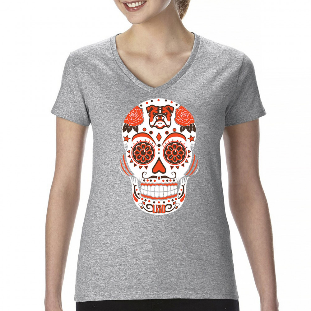 Cleveland Sugar Skull with Lake Erie pride, Rust Belt football grit, orange & brown tradition, playoff vibes, and Game Day passion.
