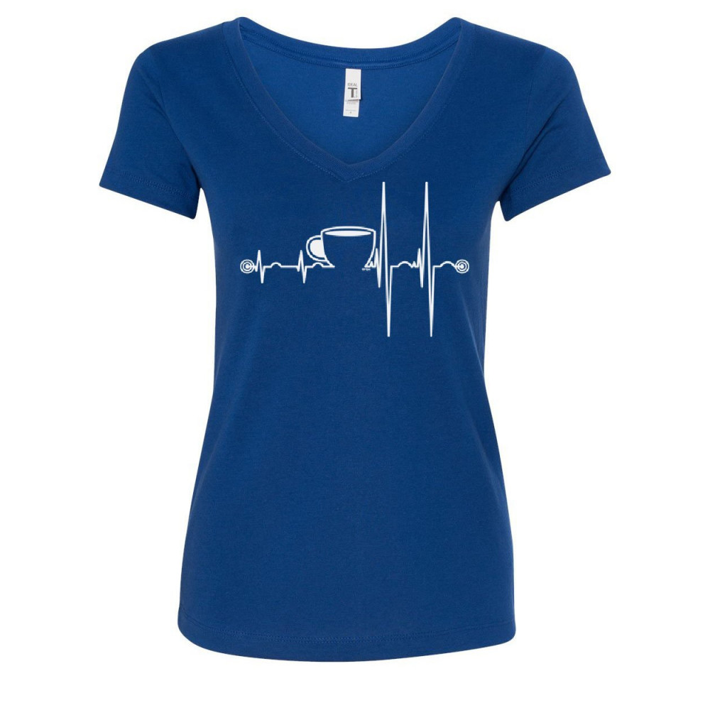COFFEE CUP HEARTBEAT women's v-neck t-shirt energy waking up coffee drinker royal blue
