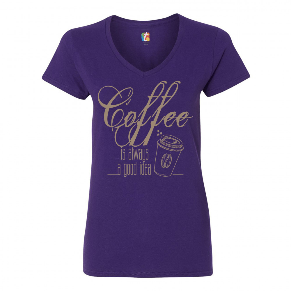 A print saying "Coffee is always a good idea". The print features a picture of a paper cup of tea with a coffee bean on it and with several hearts steaming from it. A great choice to wear to spread positive vibes and show what a passionate coffee fan you