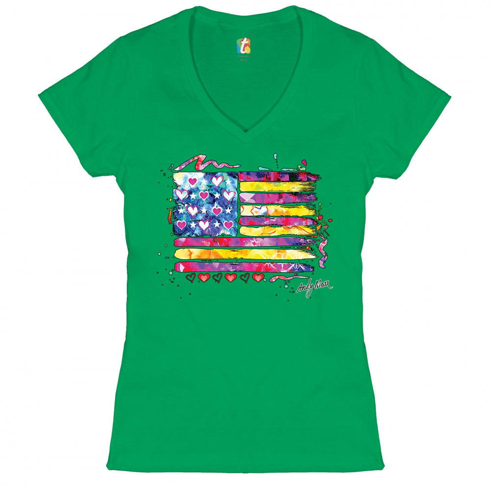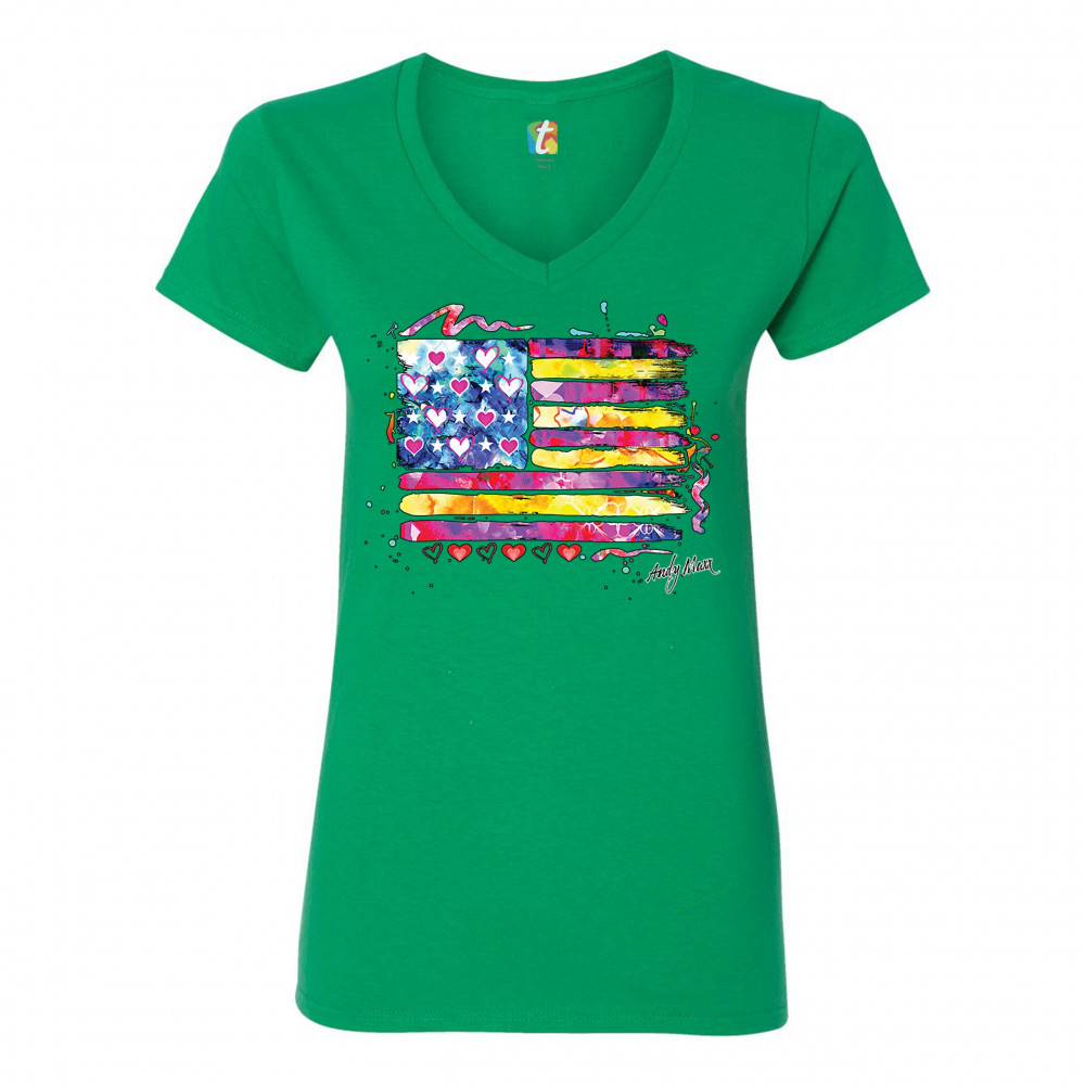 COLORFUL AMERICAN FLAG women's v-neck t-shirt patriotic 4th of july usa tee green