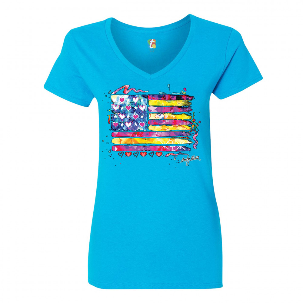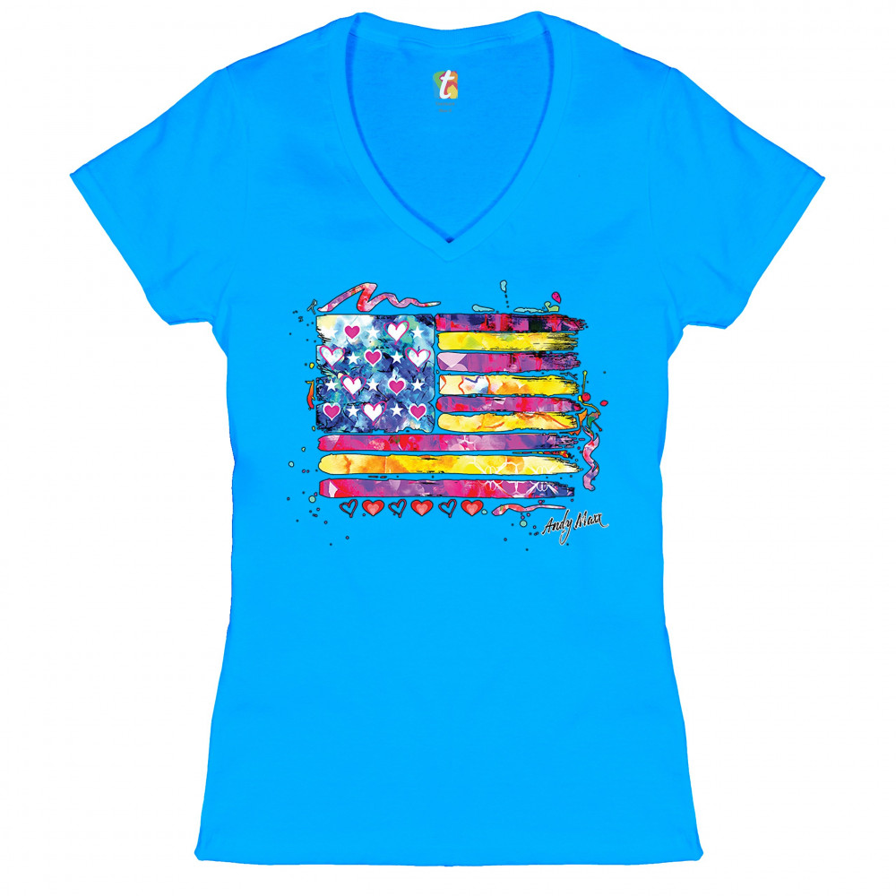 COLORFUL AMERICAN FLAG women's v-neck t-shirt patriotic 4th of july usa tee turquoise