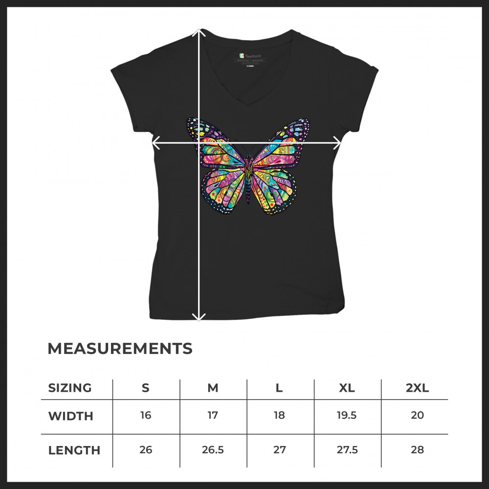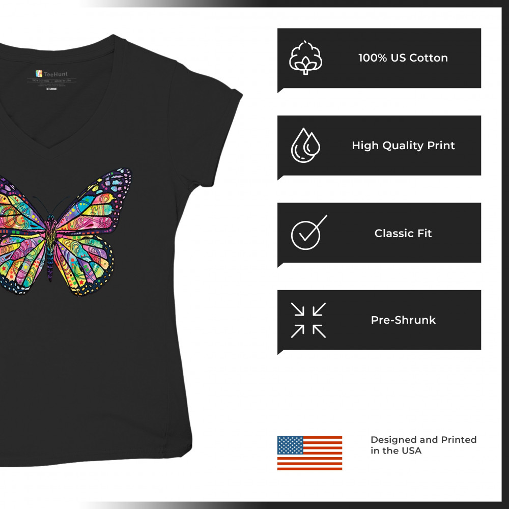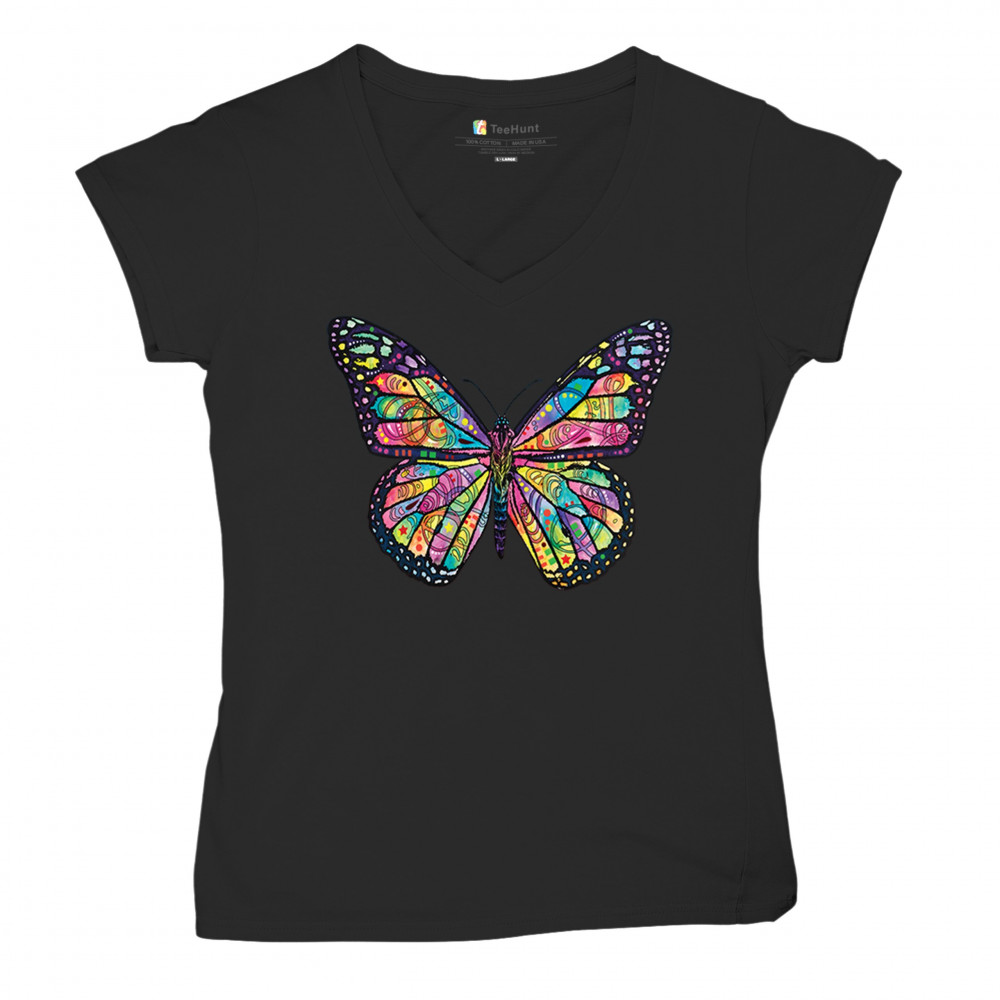 COLORFUL NEON BUTTERFLY women's v-neck t-shirt dean russo beautiful nature tee black