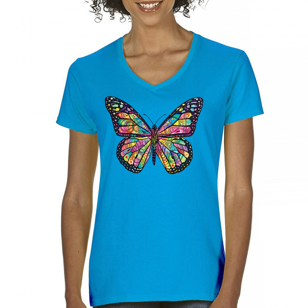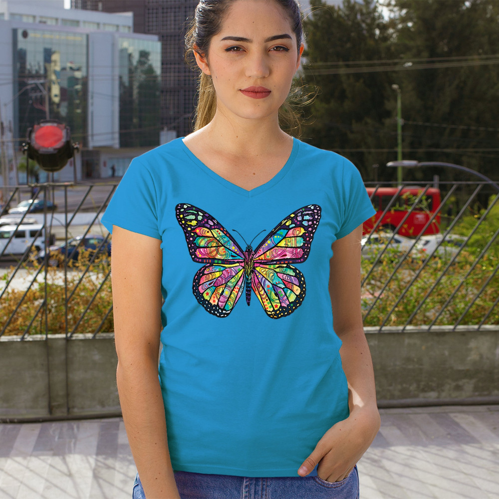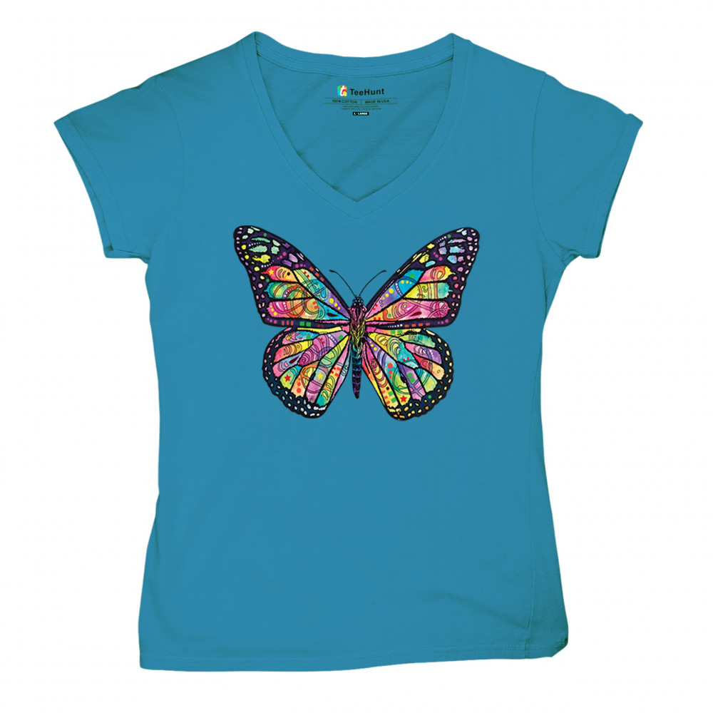 COLORFUL NEON BUTTERFLY women's v-neck t-shirt dean russo beautiful nature tee turquoise