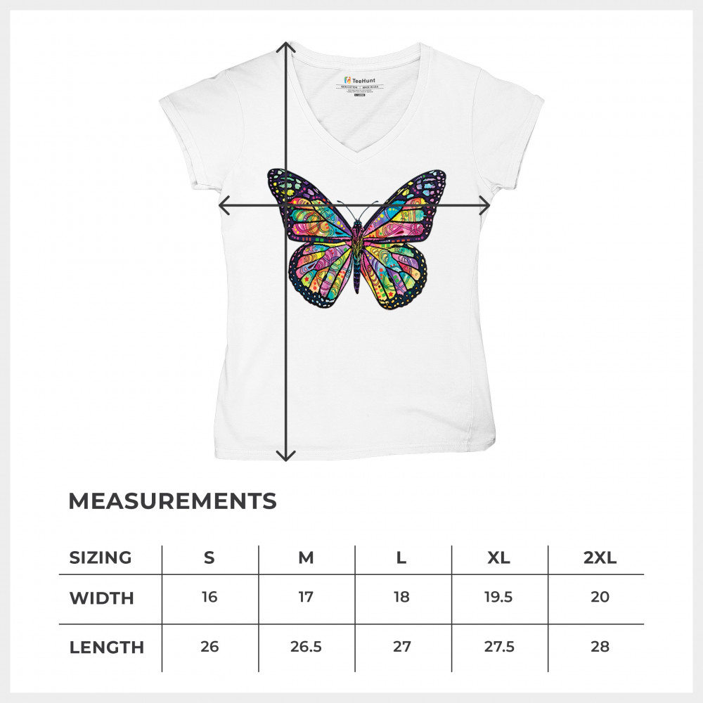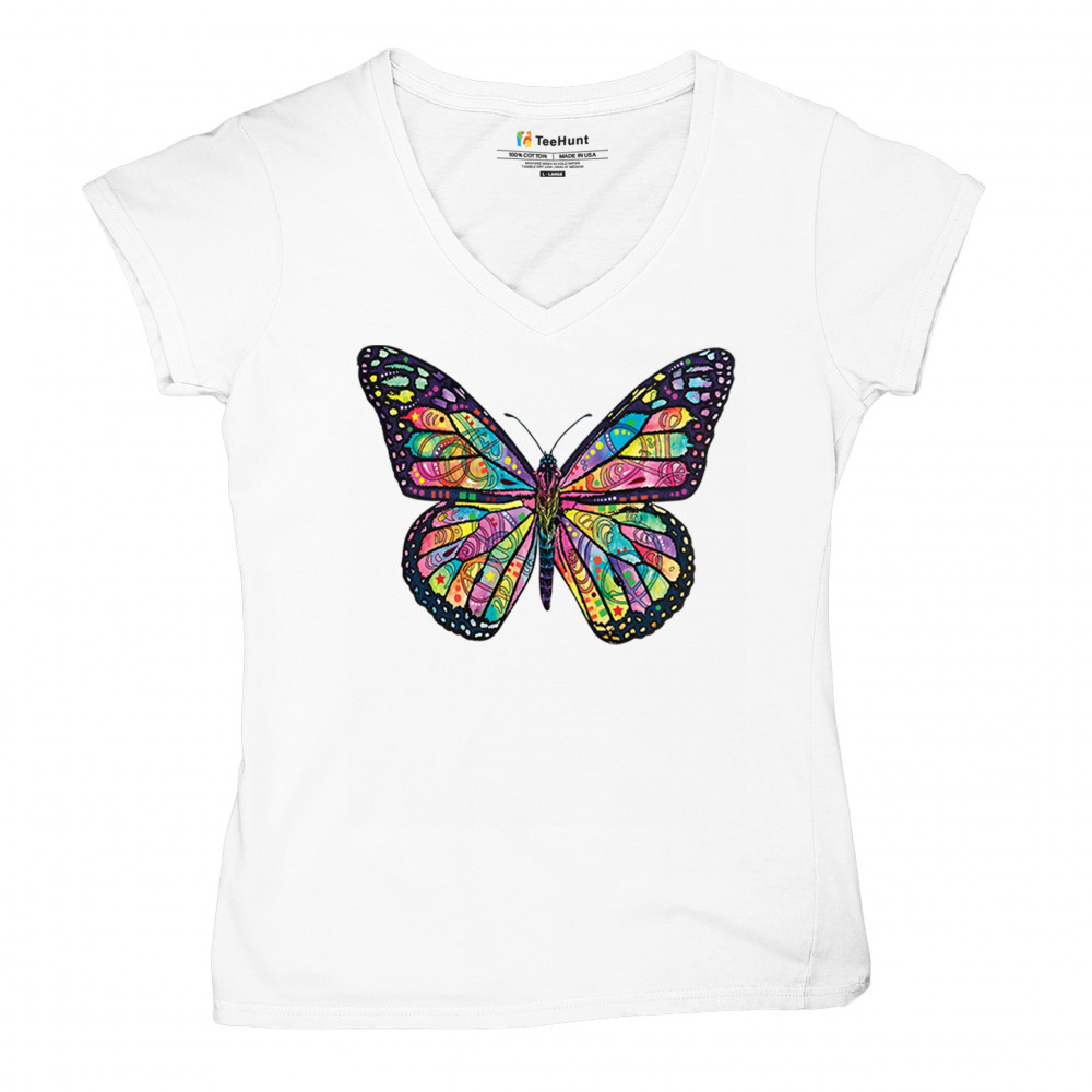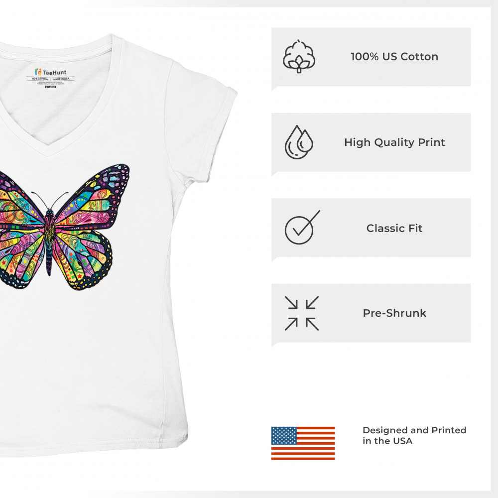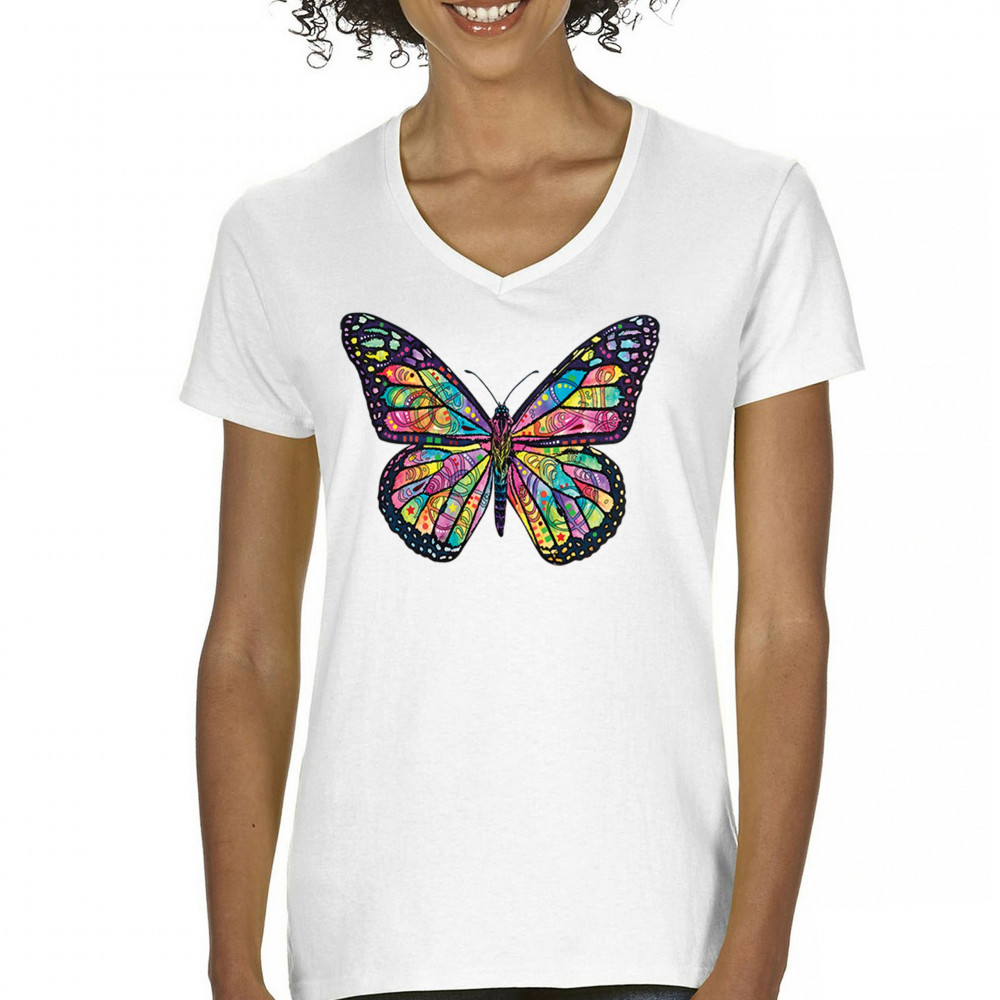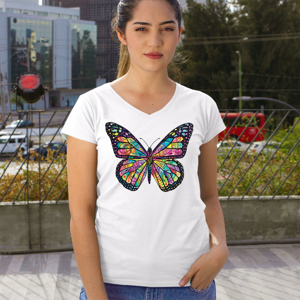 COLORFUL NEON BUTTERFLY women's v-neck t-shirt dean russo beautiful nature tee white