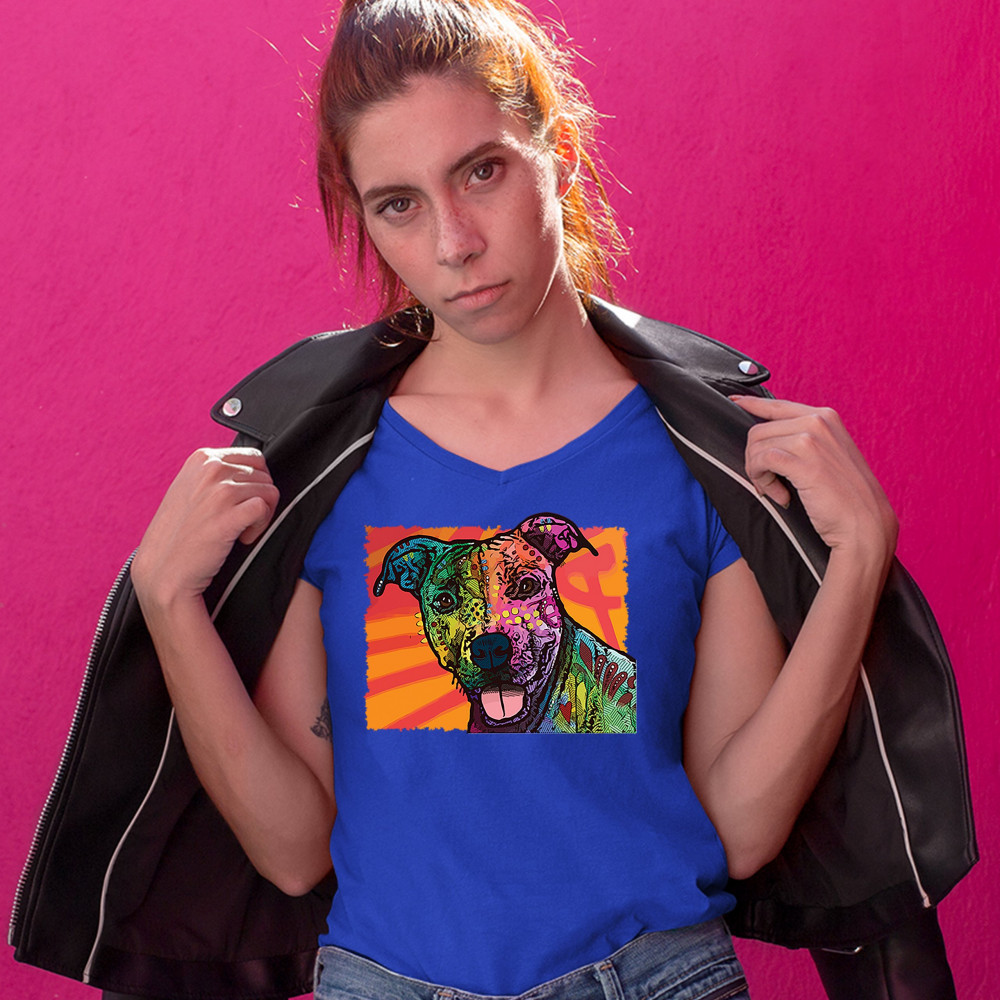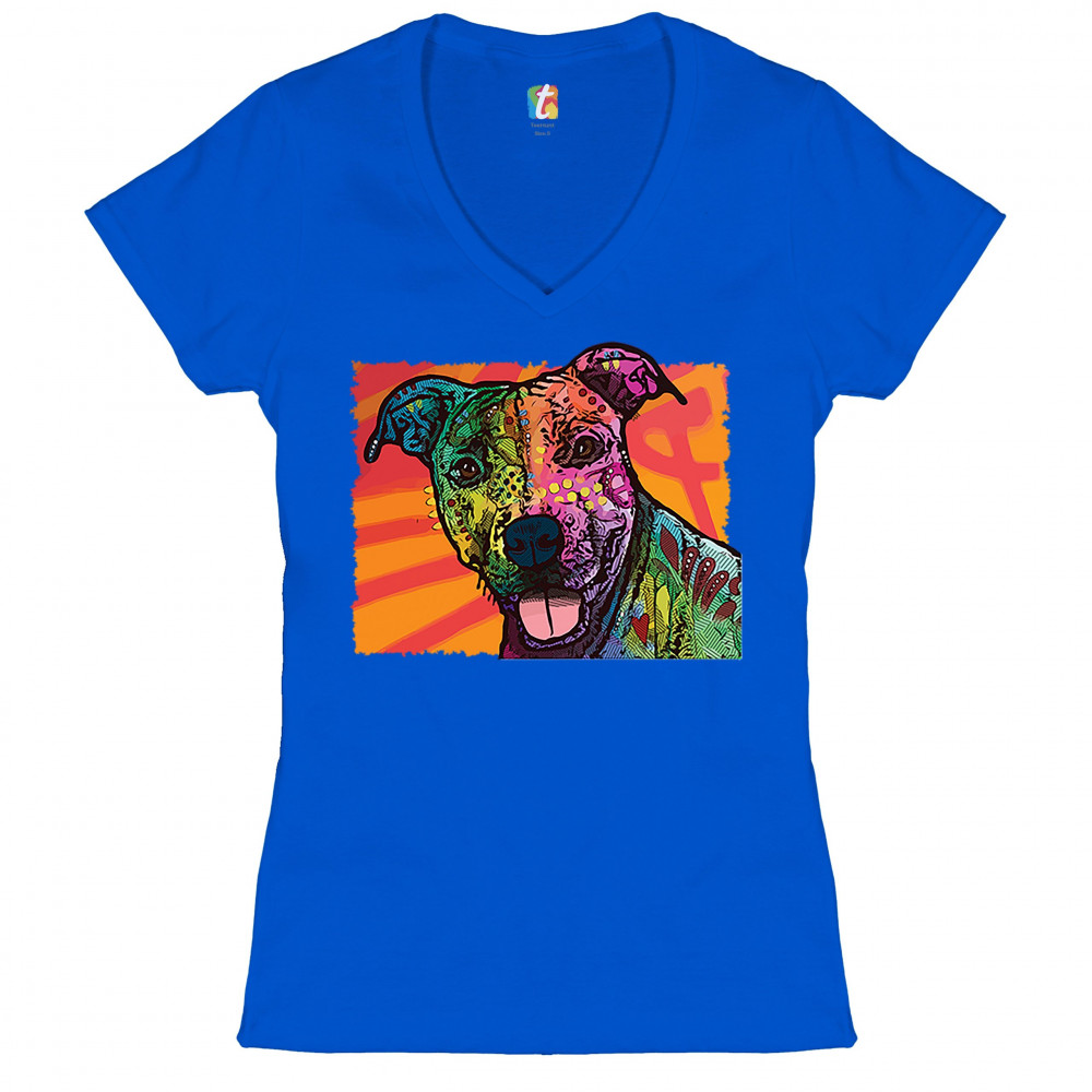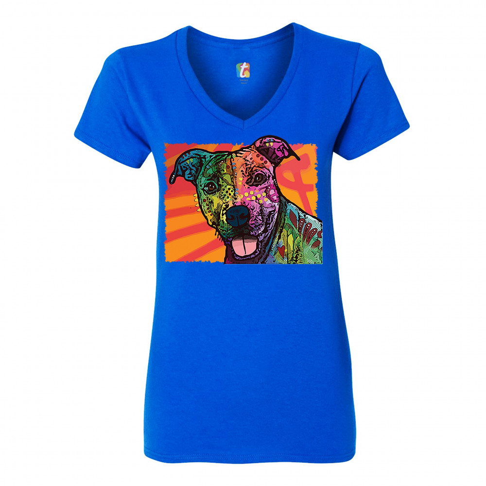 COLORFUL PITBULL women's v-neck t-shirt andy maxx dog lover adopt pet tee royal blue