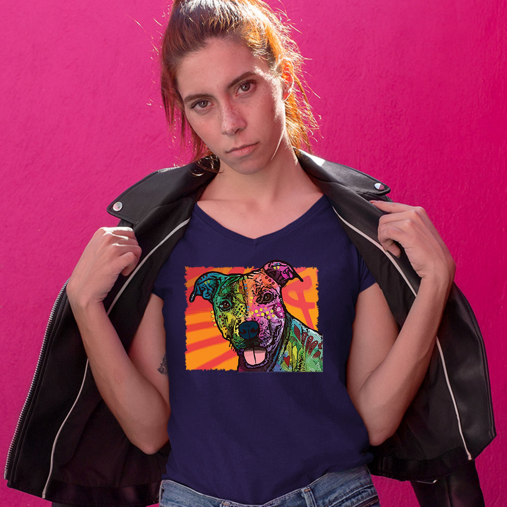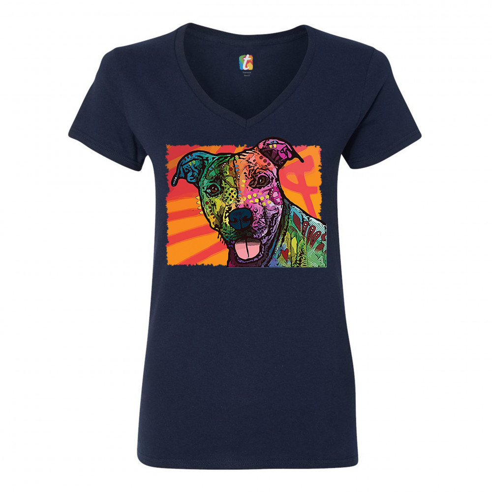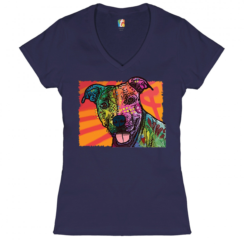COLORFUL PITBULL women's v-neck t-shirt andy maxx dog lover adopt pet tee navy blue