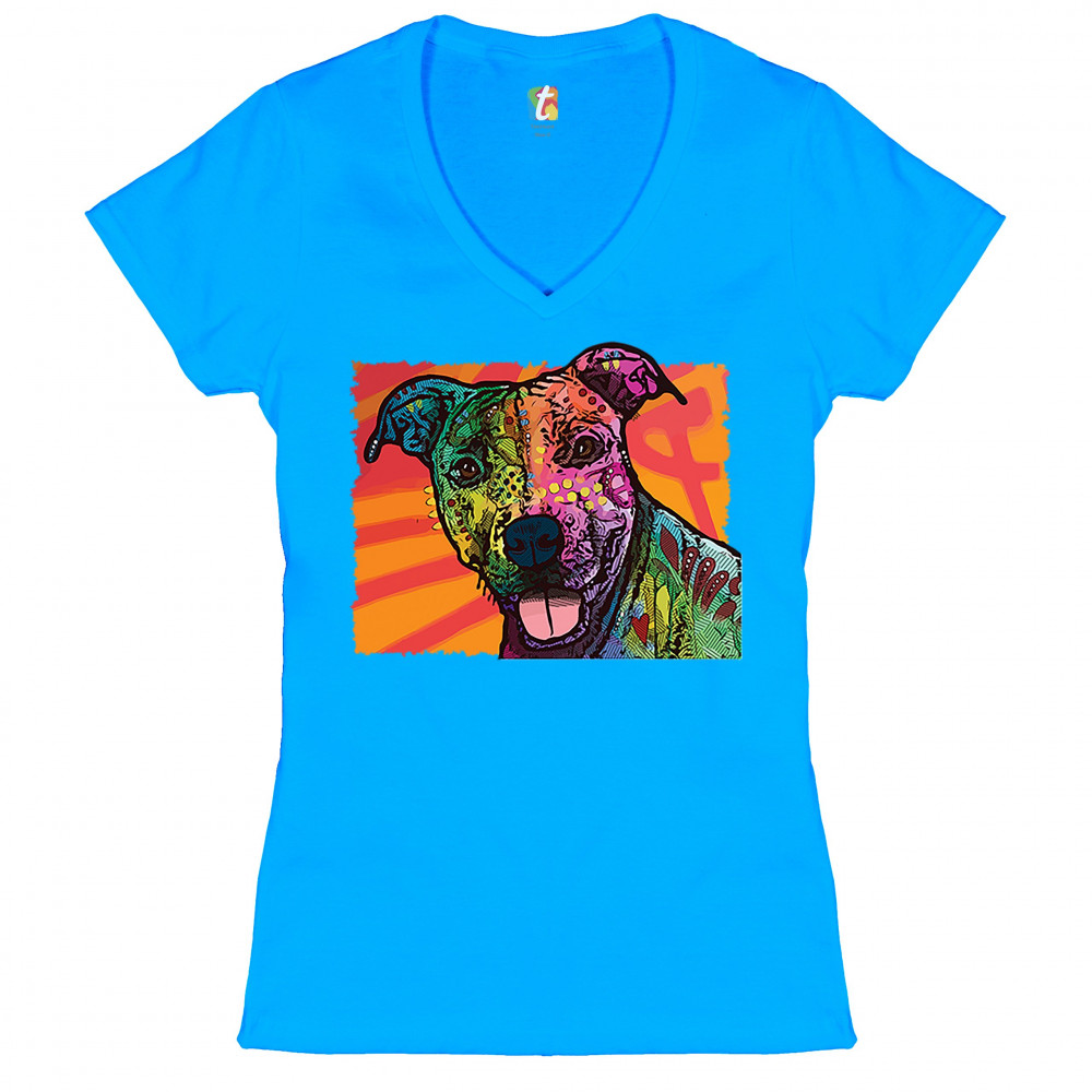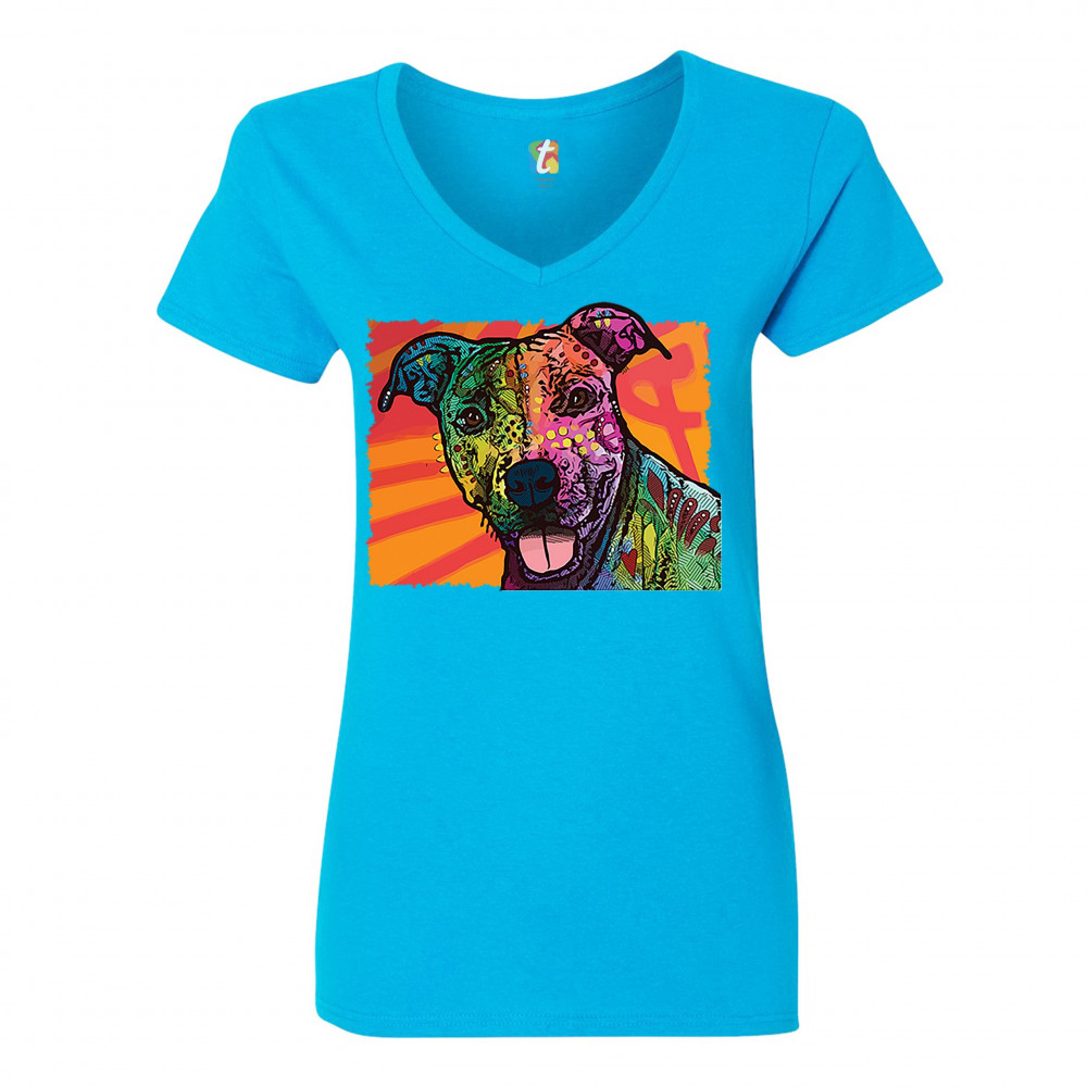 COLORFUL PITBULL women's v-neck t-shirt andy maxx dog lover adopt pet tee turquoise