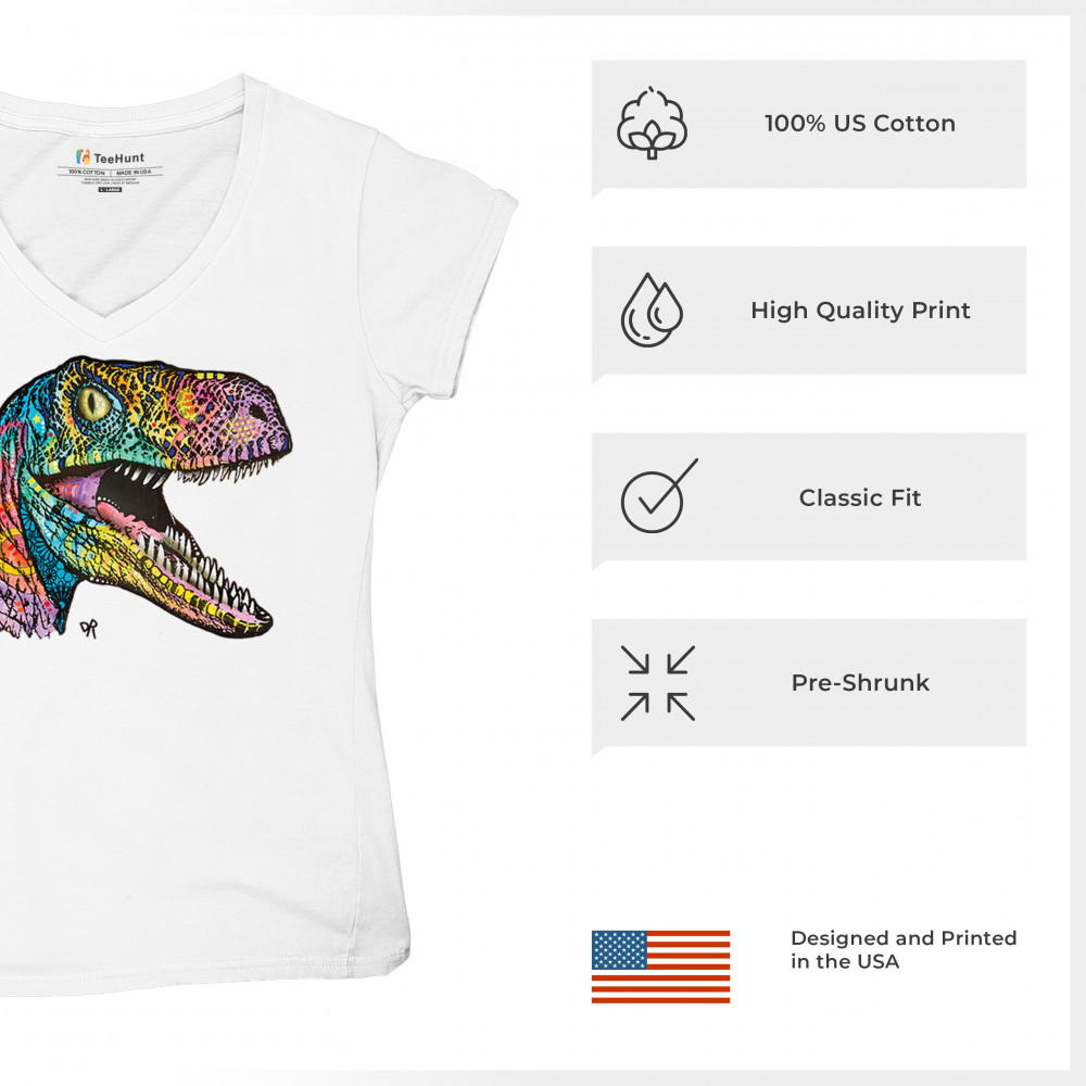 COLORFUL RAPTOR women's v-neck t-shirt dean russo neon dinosaur tee white