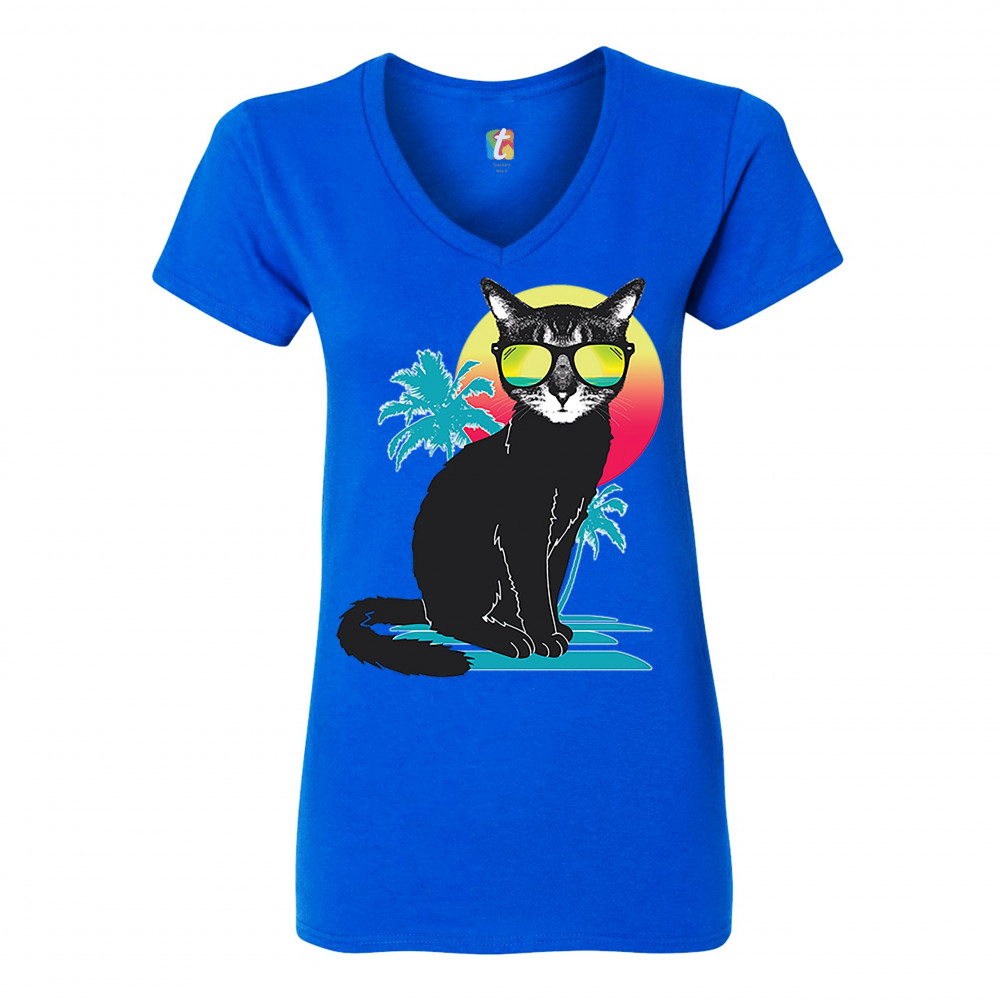 COOL SUMMER CAT women's v-neck t-shirt neon kitty on a beach animal lovers tee royal blue