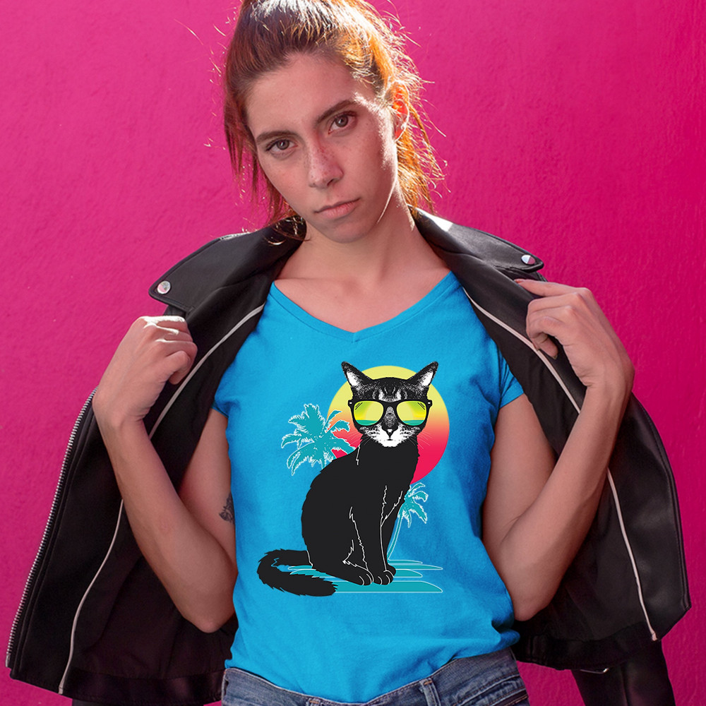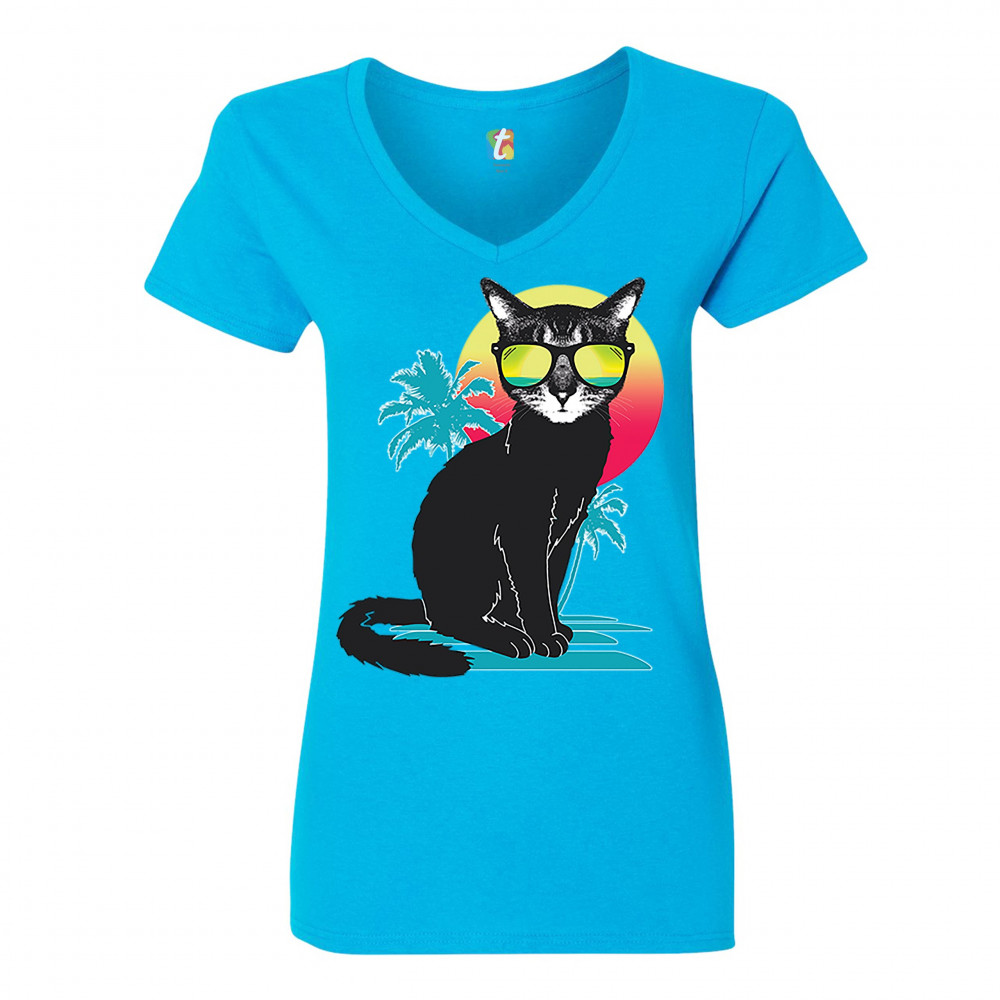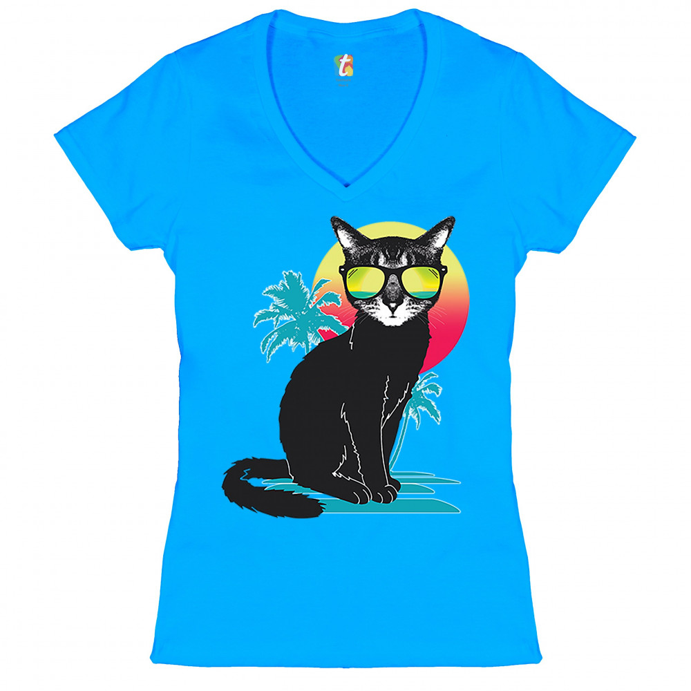 COOL SUMMER CAT women's v-neck t-shirt neon kitty on a beach animal lovers tee turquoise