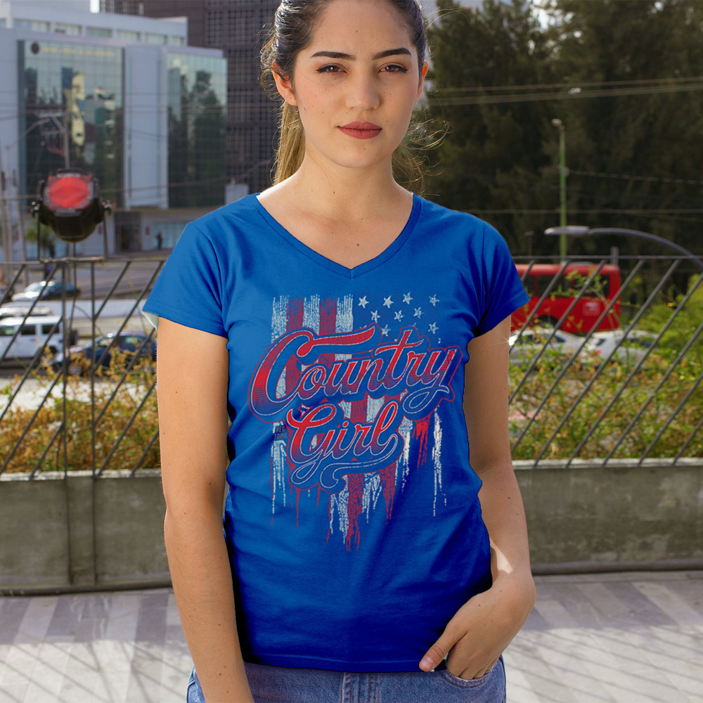 Patriotic country girl design with flag backdrop and bold script—perfect for rodeos, BBQs, ranch life, or 4th of July pride.