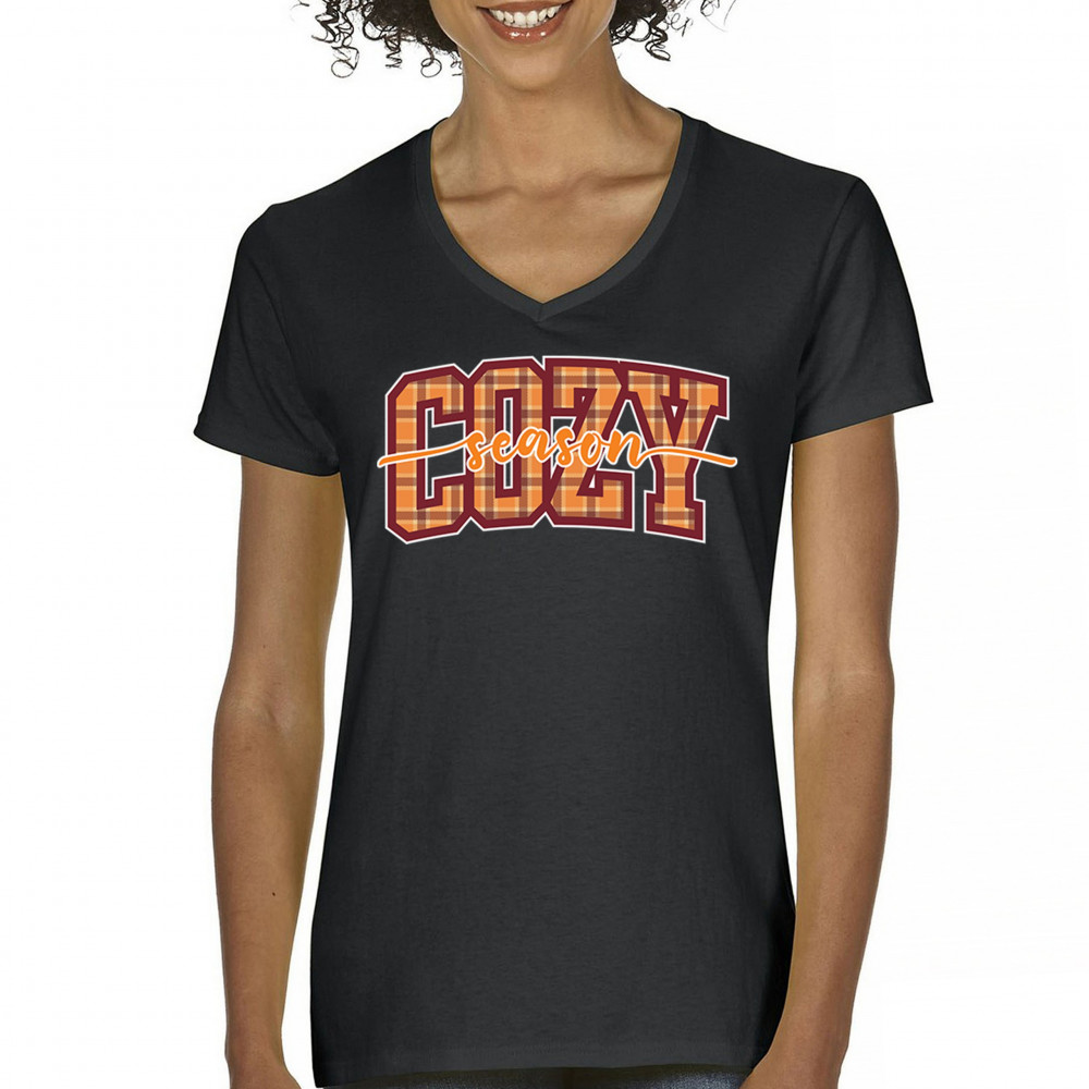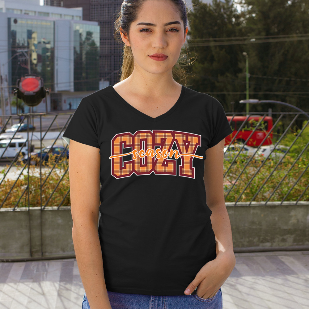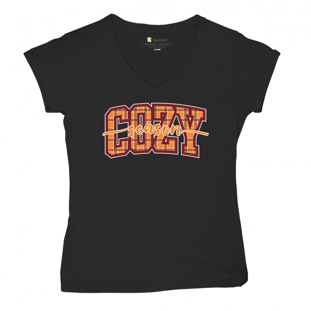 COZY SEASON women's v-neck t-shirt fall pumpkin thanksgiving turkey day tee black