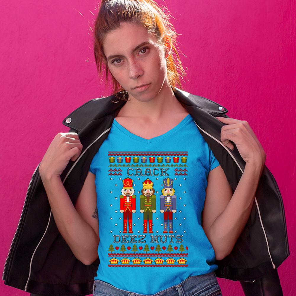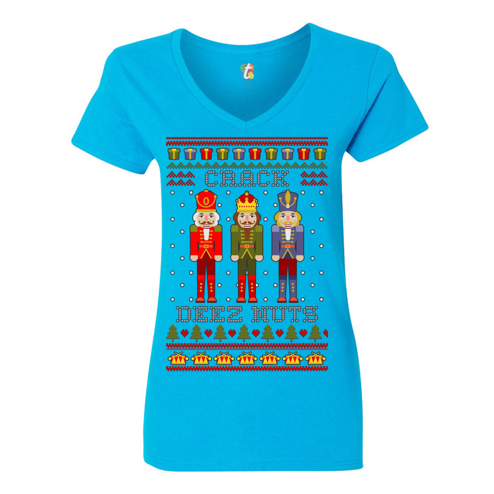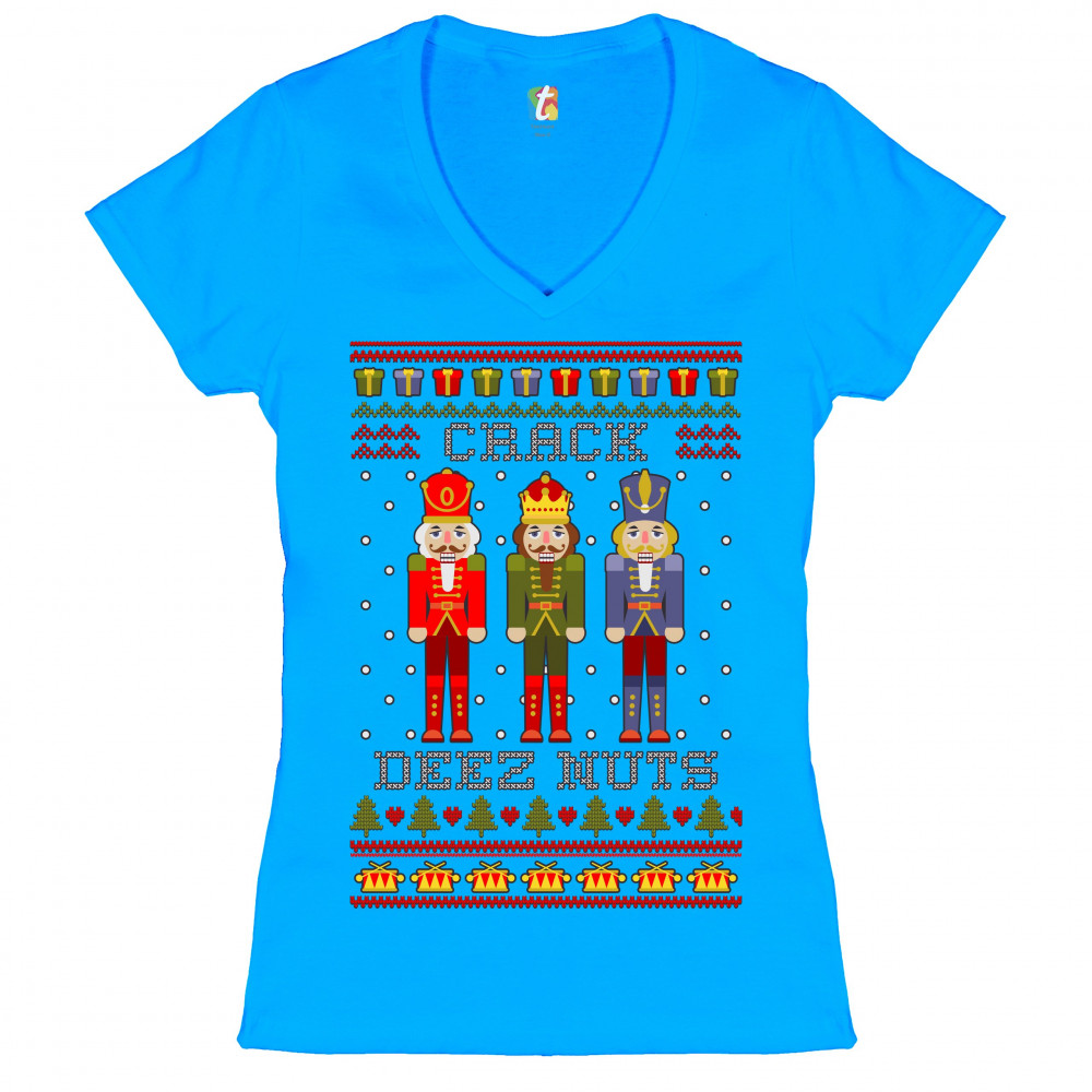CRACK DEEZ NUTS women's v-neck t-shirt christmas nutcracker ugly sweater tee turquoise