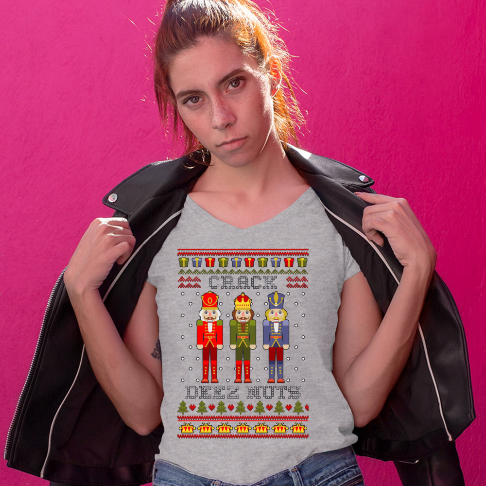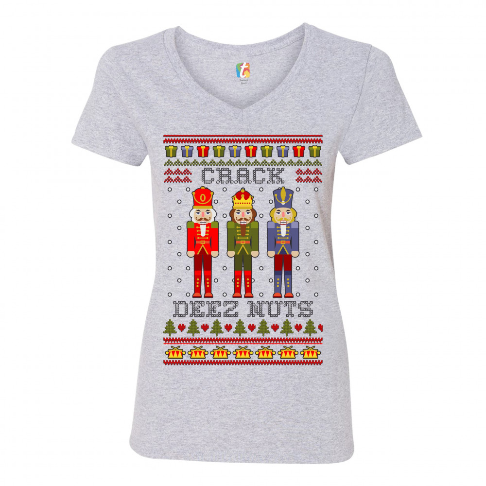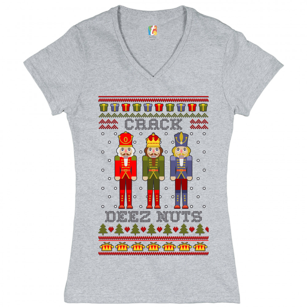 CRACK DEEZ NUTS women's v-neck t-shirt christmas nutcracker ugly sweater tee gray