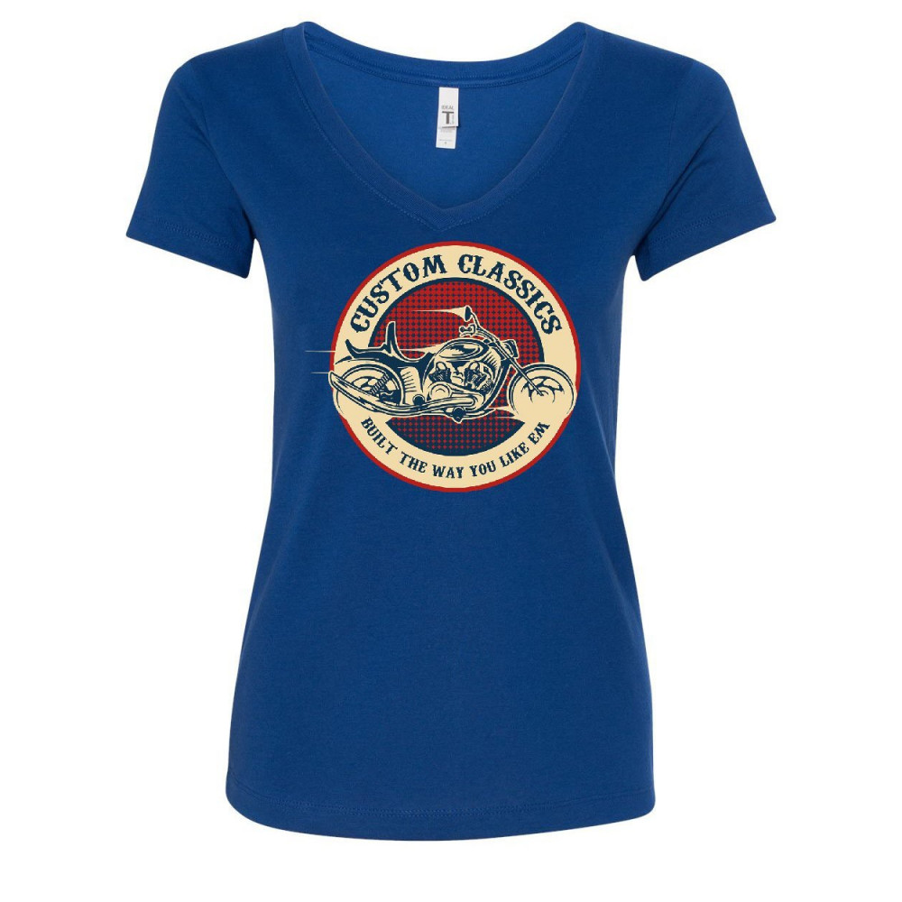 CUSTOM CLASSICS women's v-neck t-shirt chopper bobber biker rte 66 live to ride royal blue
