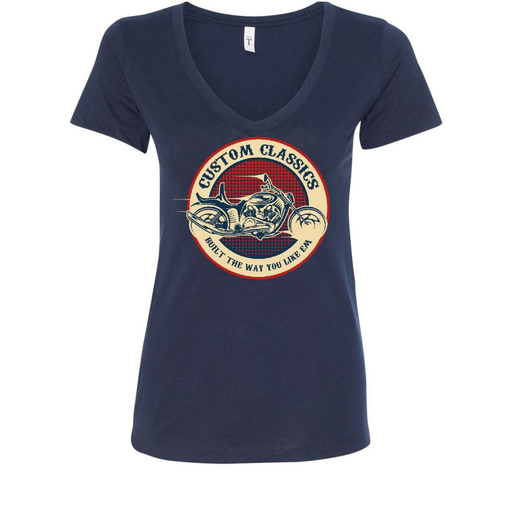 CUSTOM CLASSICS women's v-neck t-shirt chopper bobber biker rte 66 live to ride navy blue