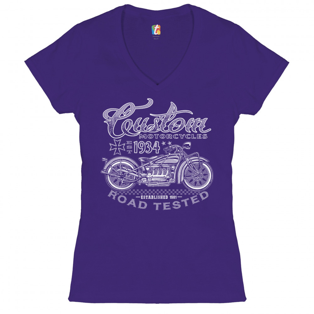 CUSTOM MOTORCYCLES ROAD TESTED women's v-neck t-shirt bobber biker gang mc tee purple