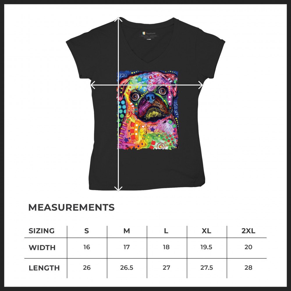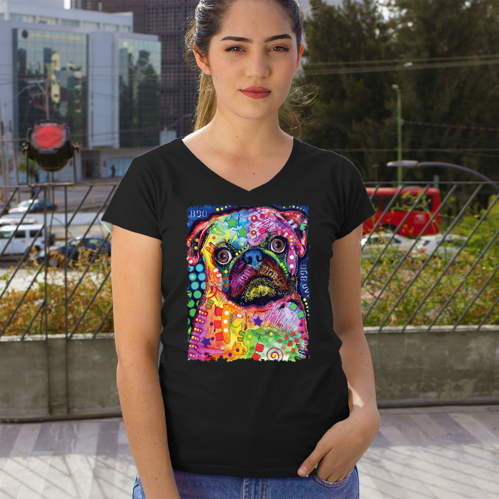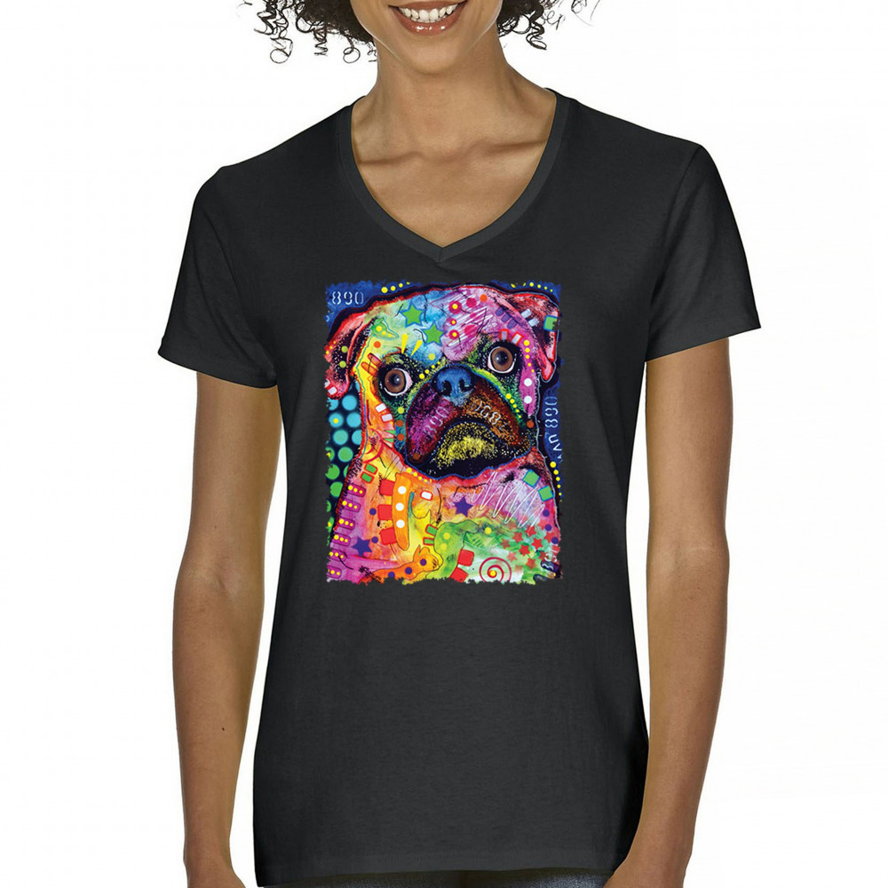 CUTE PUG PUPPY women's v-neck t-shirt dean russo colorful neon mosaic dog tee black