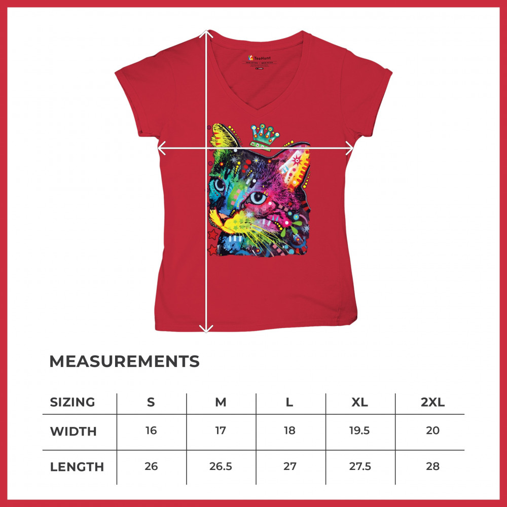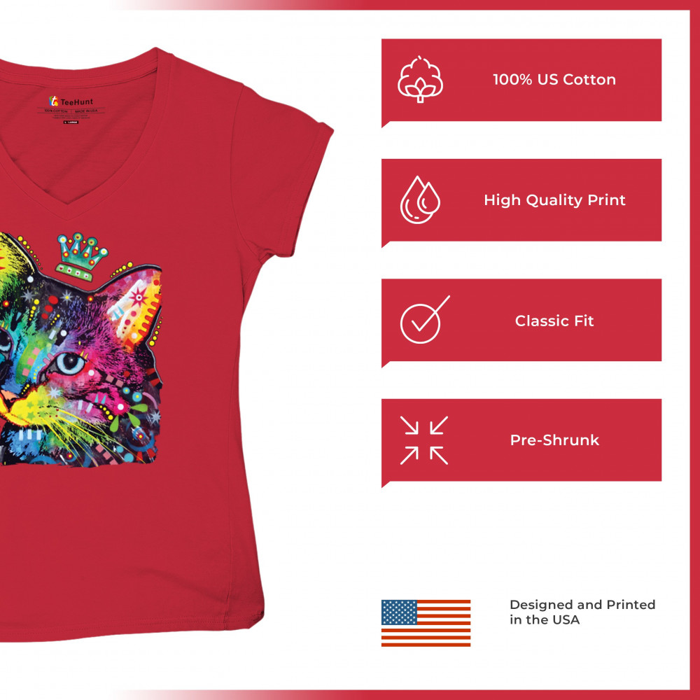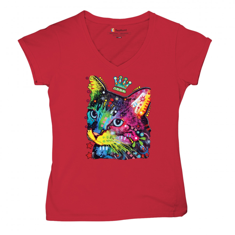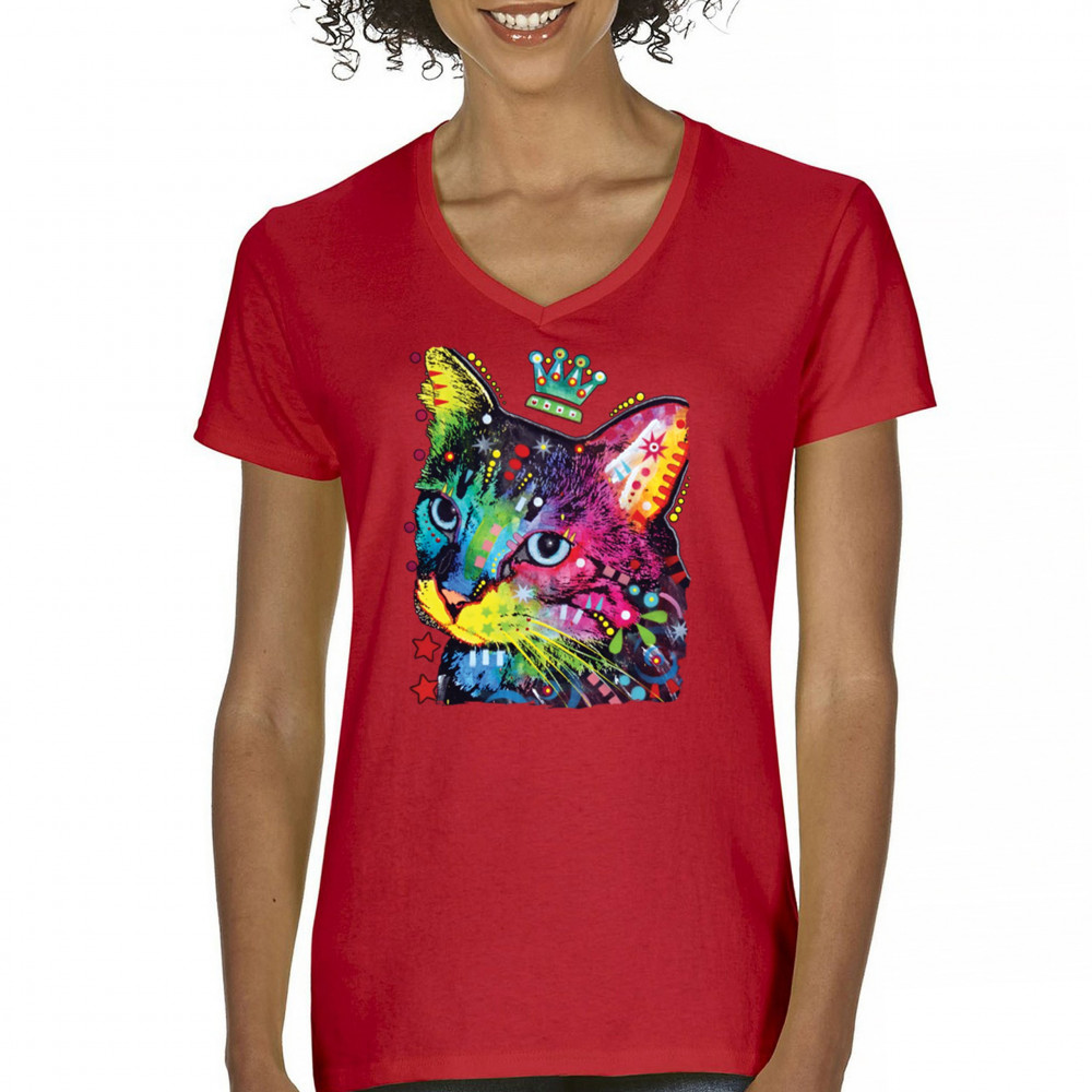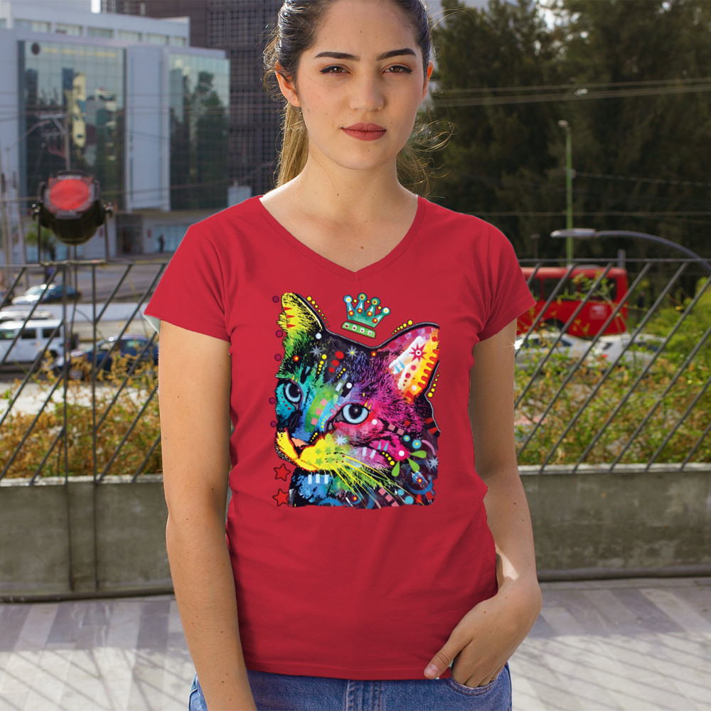 CUTE THINKING CROWNED CAT women's v-neck t-shirt dean russo colorful kitten tee red