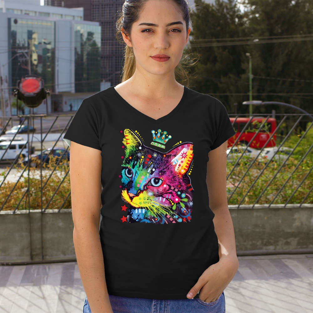 CUTE THINKING CROWNED CAT women's v-neck t-shirt dean russo colorful kitten tee black