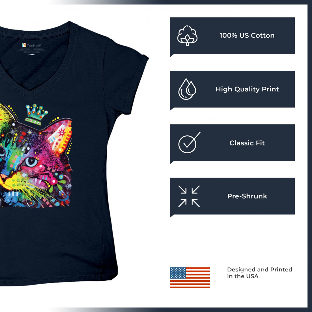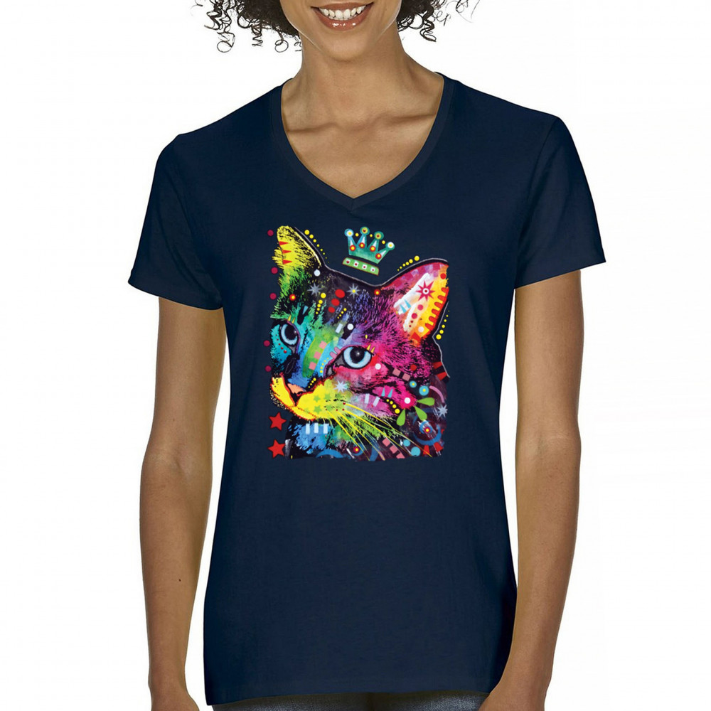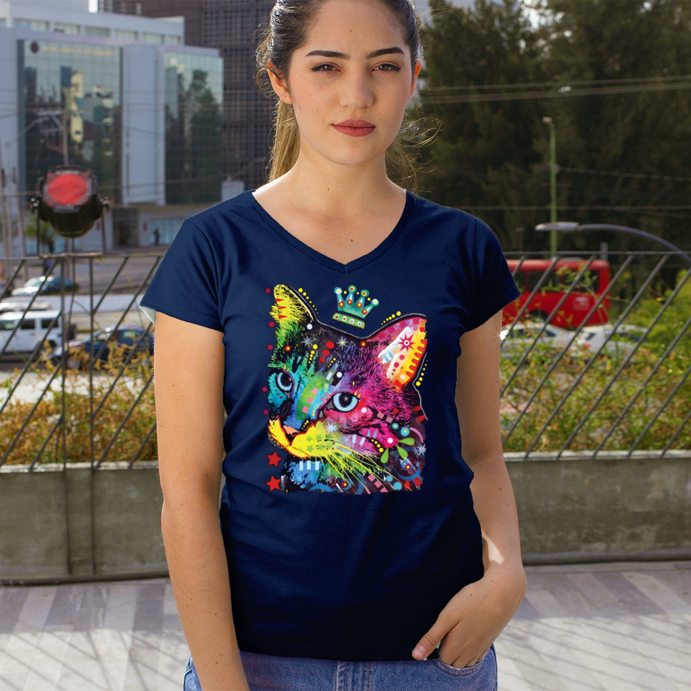 CUTE THINKING CROWNED CAT women's v-neck t-shirt dean russo colorful kitten tee navy blue