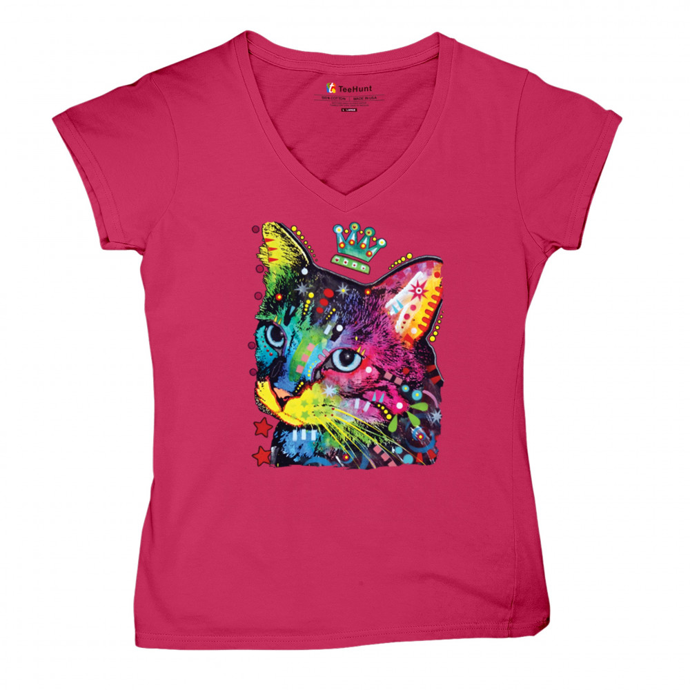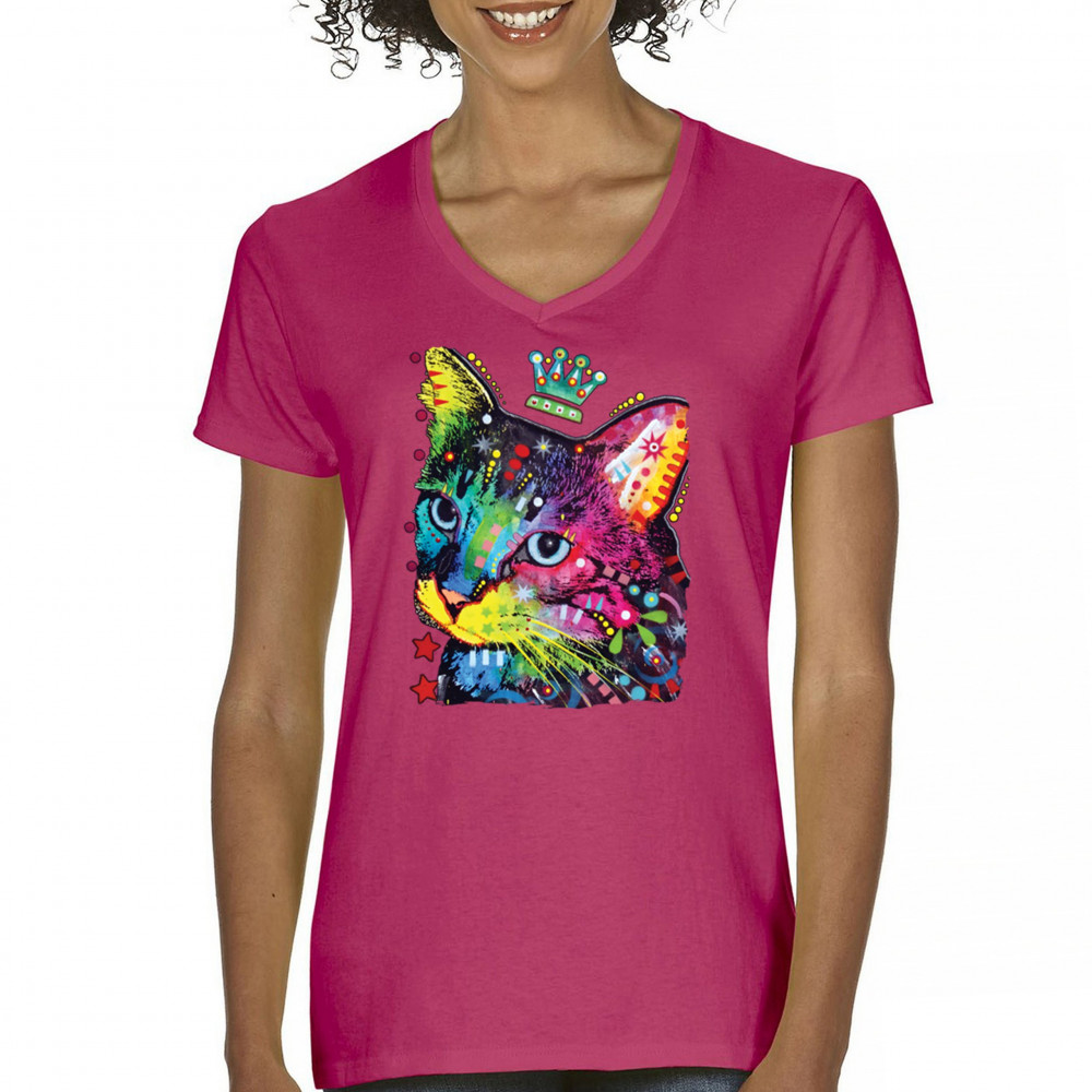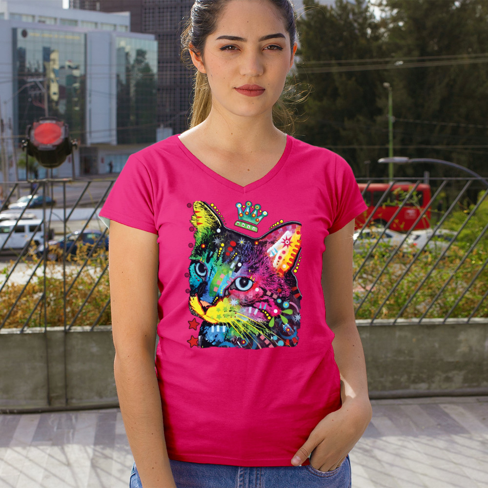 CUTE THINKING CROWNED CAT women's v-neck t-shirt dean russo colorful kitten tee pink