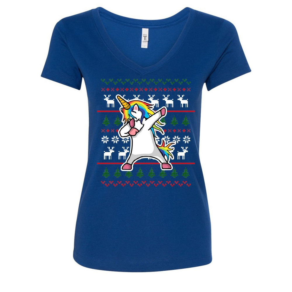 DABBING UNICORN ugly sweater women's v-neck t-shirt christmas xmas dab rudolph royal blue