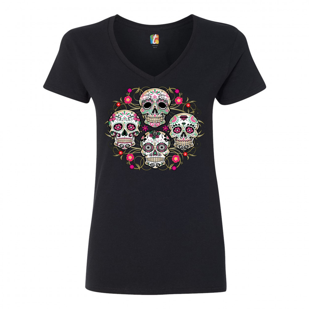 DAY OF THE DEAD FLORAL SUGAR SKULLS day of the dead sugar skulls women's v-neck t-shirt dia de los muertos tee black