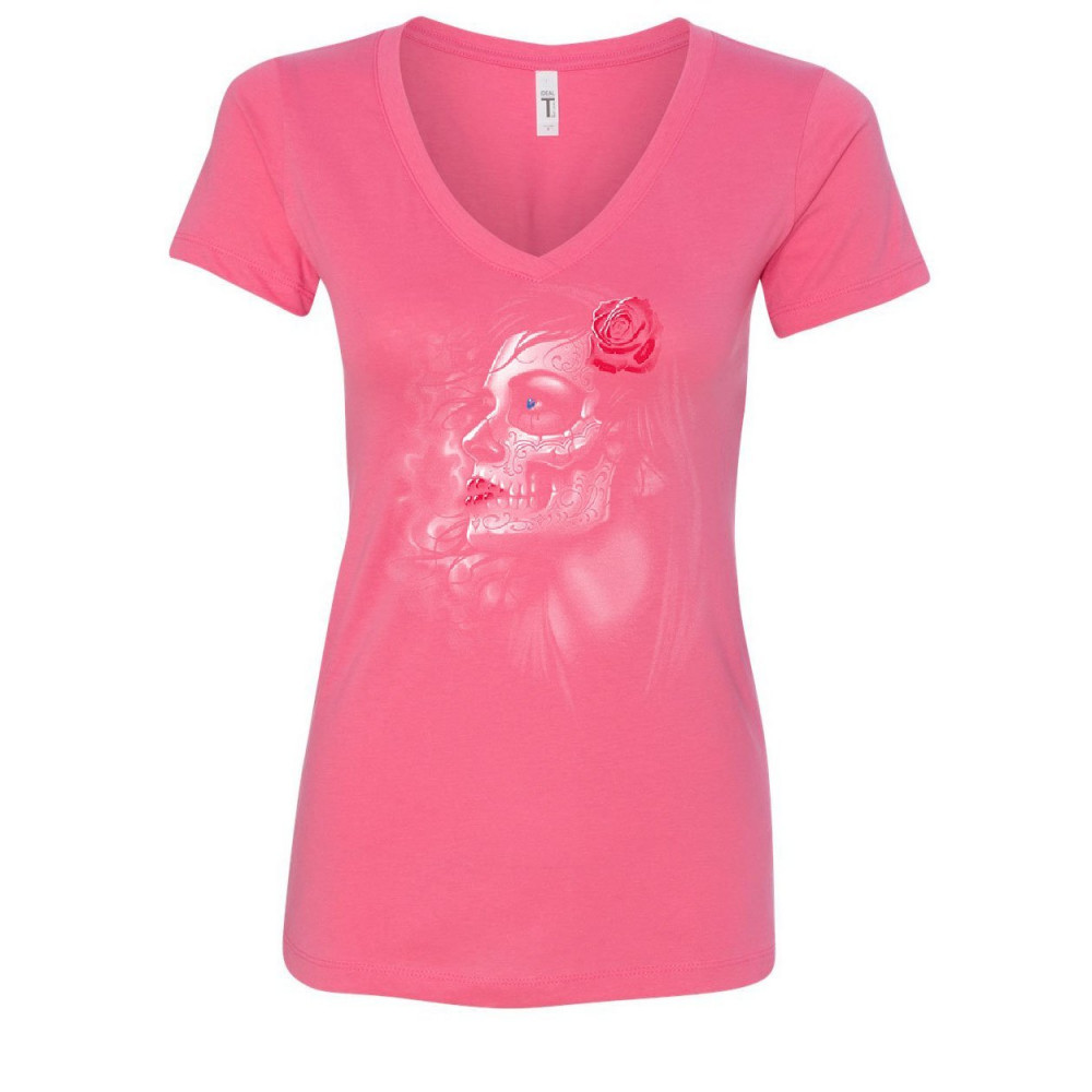 DAY OF THE DEAD GIRL women's v-neck t-shirt skull face dia de los muertos roses pink