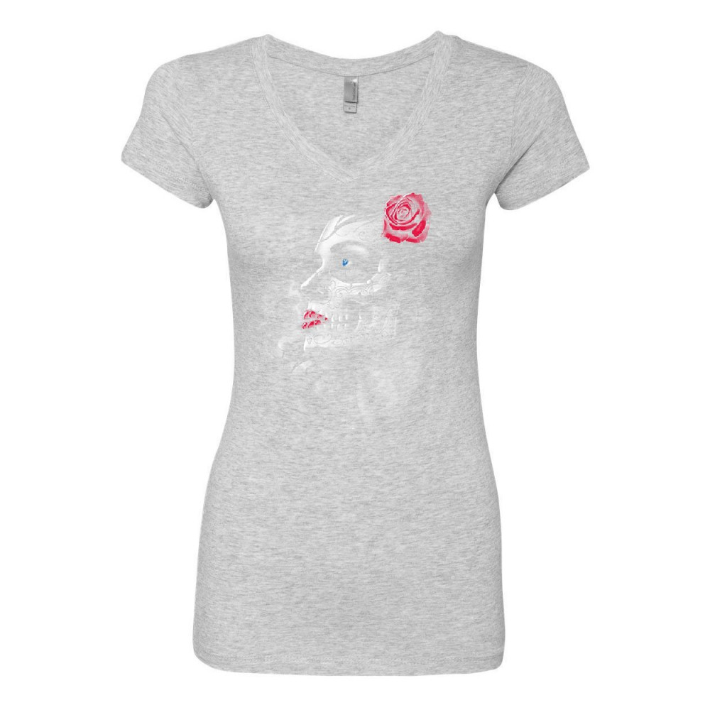 DAY OF THE DEAD GIRL women's v-neck t-shirt skull face dia de los muertos roses gray