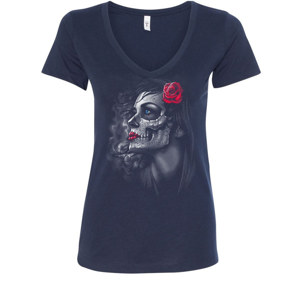 DAY OF THE DEAD GIRL women's v-neck t-shirt skull face dia de los muertos roses navy blue