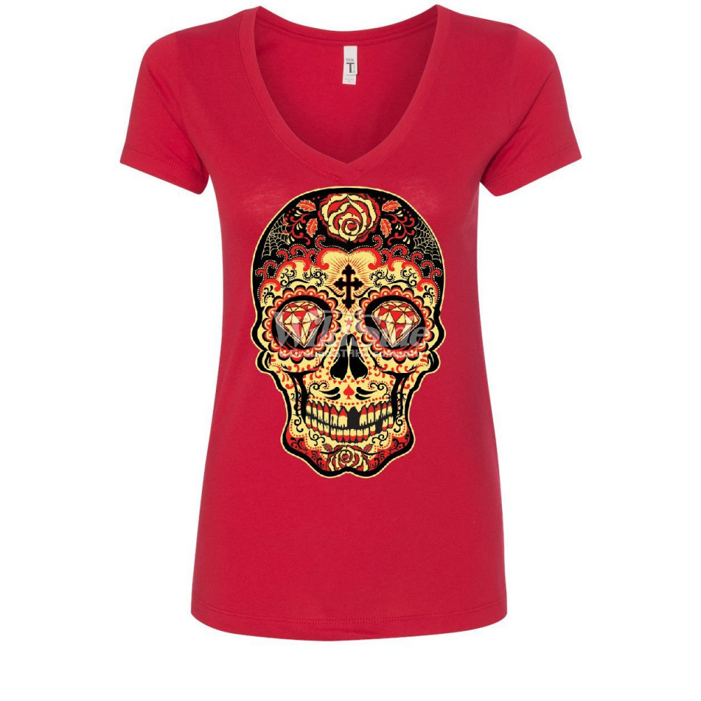 DAY OF THE DEAD SUGAR SKULL women's v-neck t-shirt gold calavera dia de muertos red