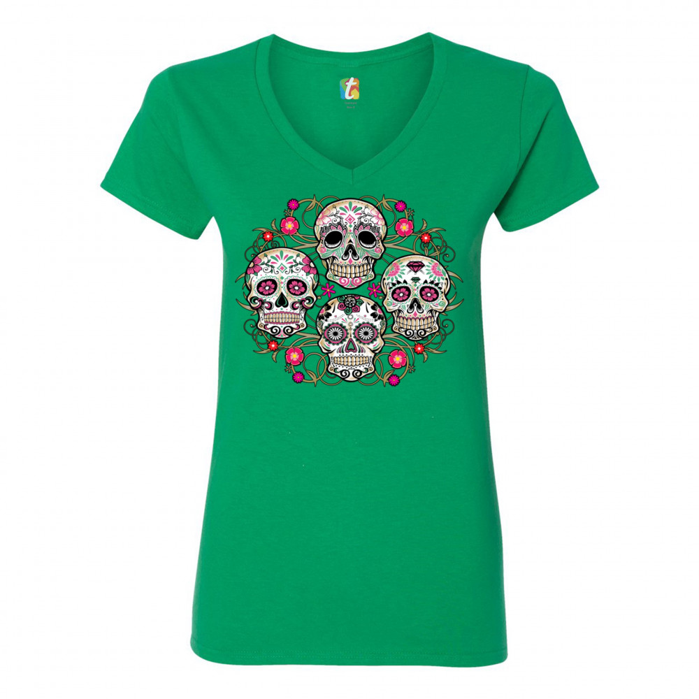 DAY OF THE DEAD FLORAL SUGAR SKULLS day of the dead sugar skulls women's v-neck t-shirt dia de los muertos tee green