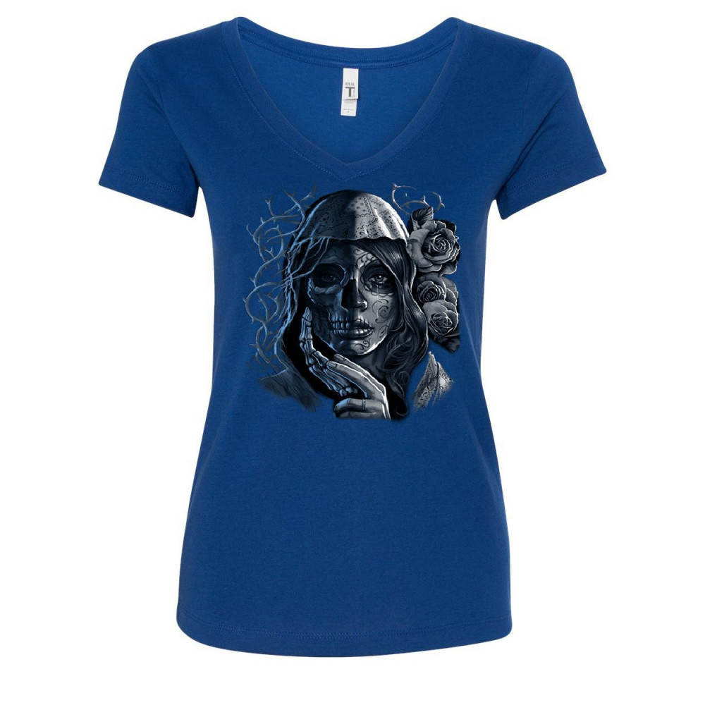 DEAD GIRL WITH ROSES women's v-neck t-shirt sugar skull face day of the dead royal blue
