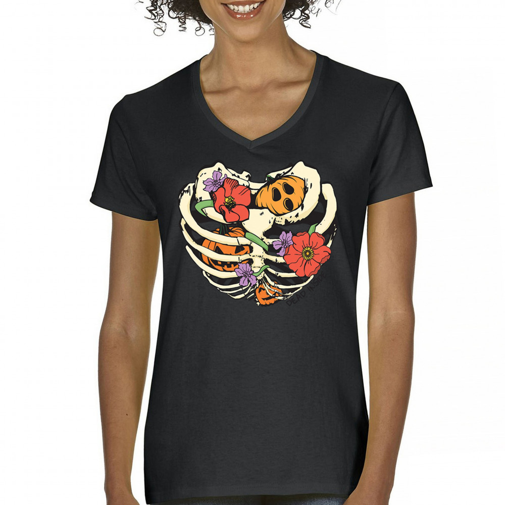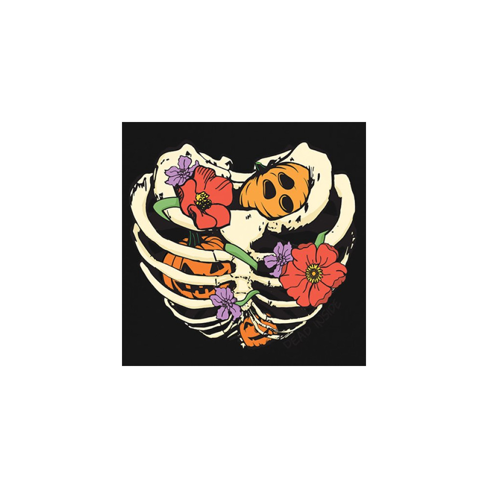 Celebrate Halloween with a quirky and cute design featuring a skeleton ribcage filled with pumpkins and flowers. Perfect for spooky season lovers!