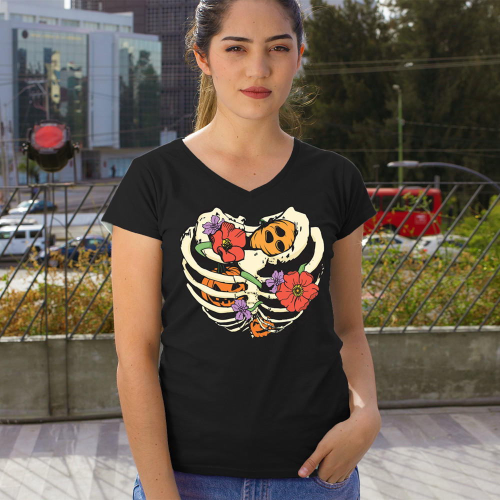 This Halloween-inspired design is sure to turn heads. The image features a skeleton ribcage with pumpkins and flowers intertwined, giving it a quirky yet cute appearance. Whether you’re preparing for a Halloween bash, getting ready for a night of trick-or-treating, or just want to celebrate the fall season in style, this graphic is a must-have. With its mix of spooky and sweet, it's perfect for anyone who loves a fun and festive look for the Halloween season.
