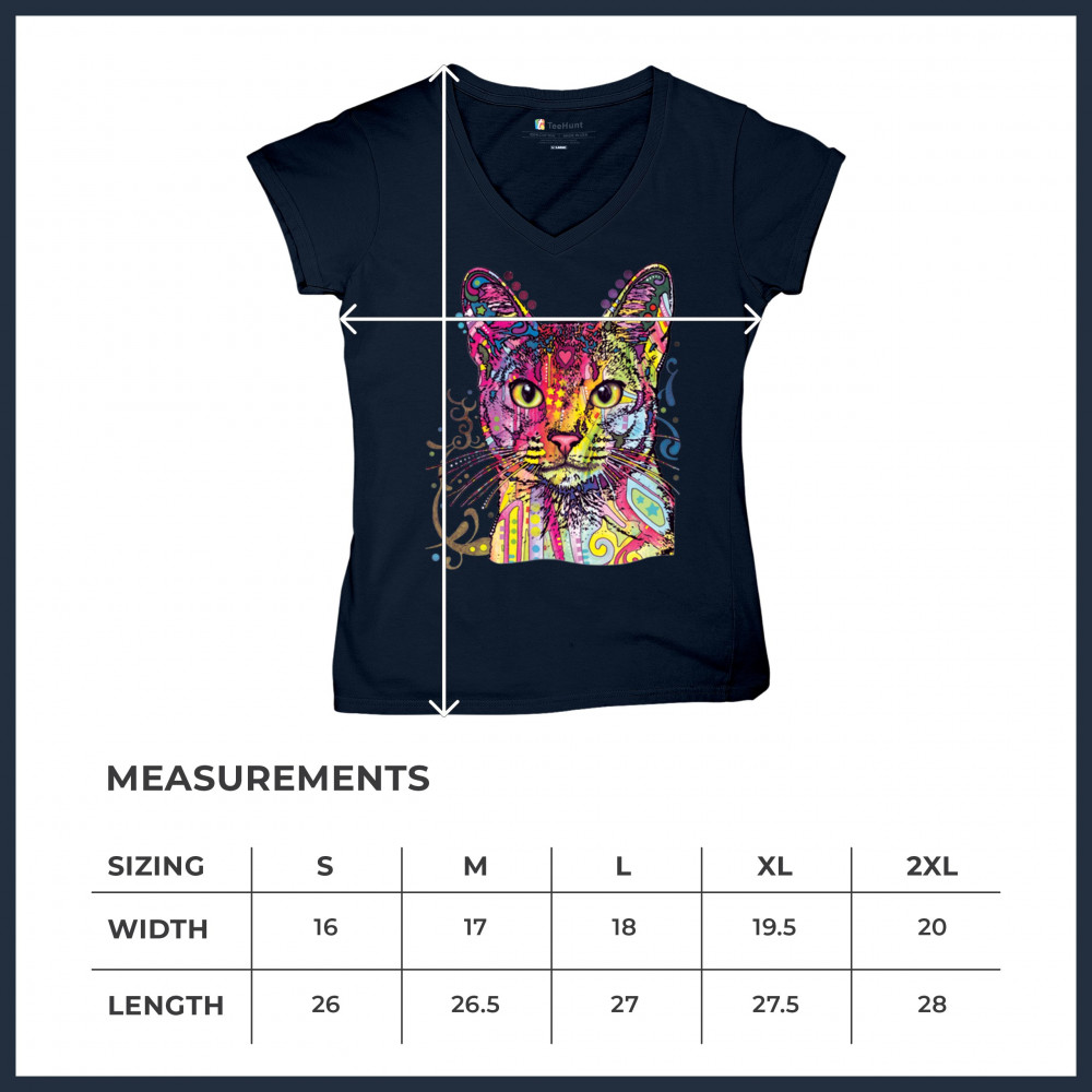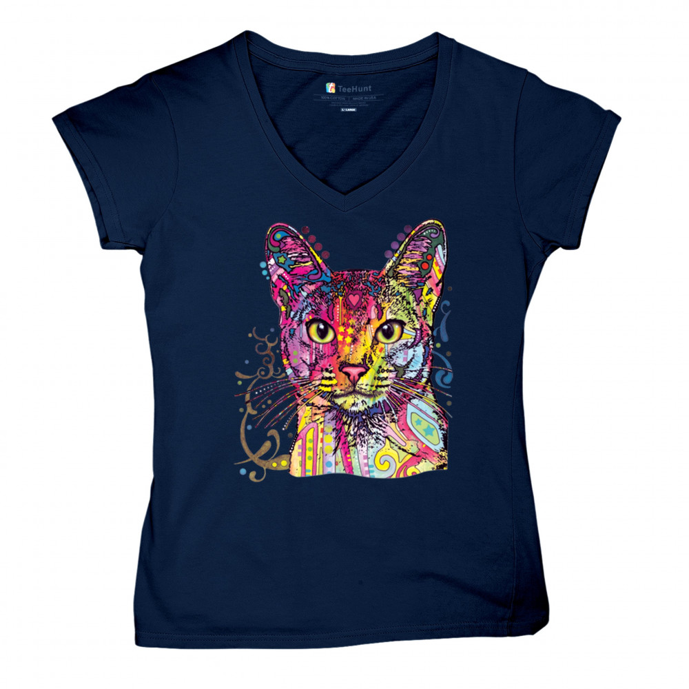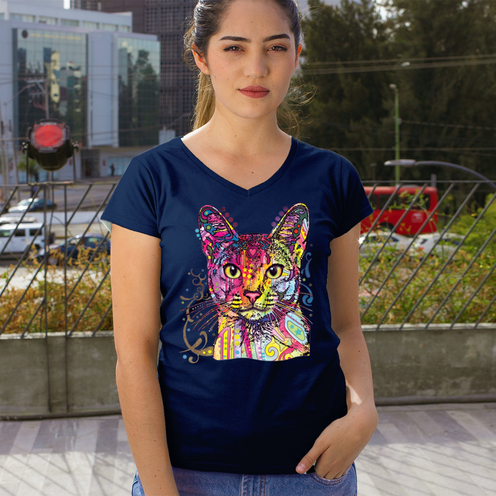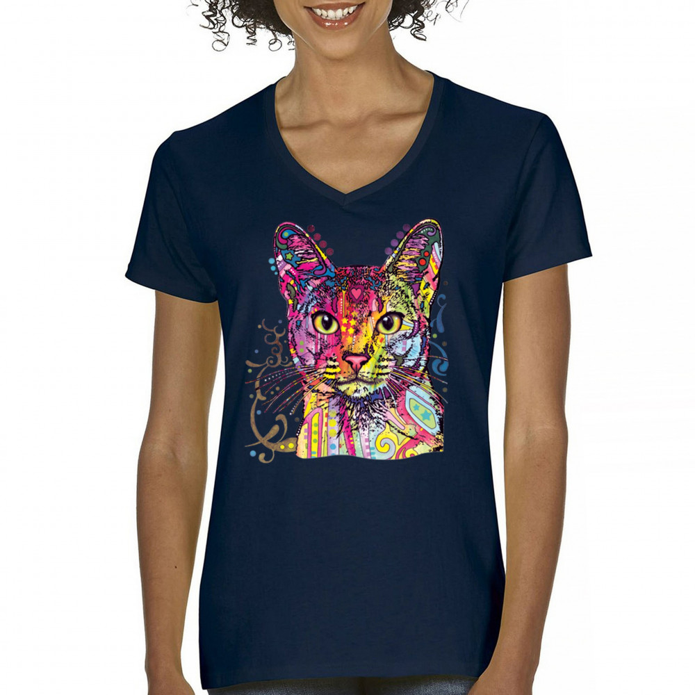 DEAN RUSSO ABYSSINIAN CAT women's v-neck t-shirt colorful cute kitten pet tee navy blue