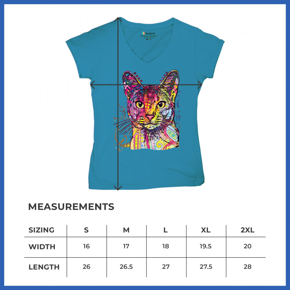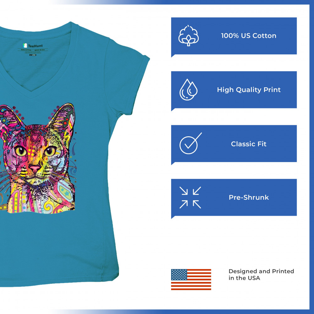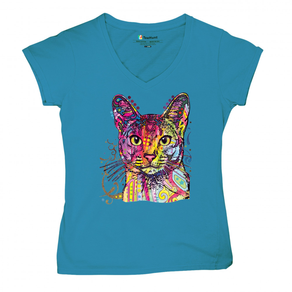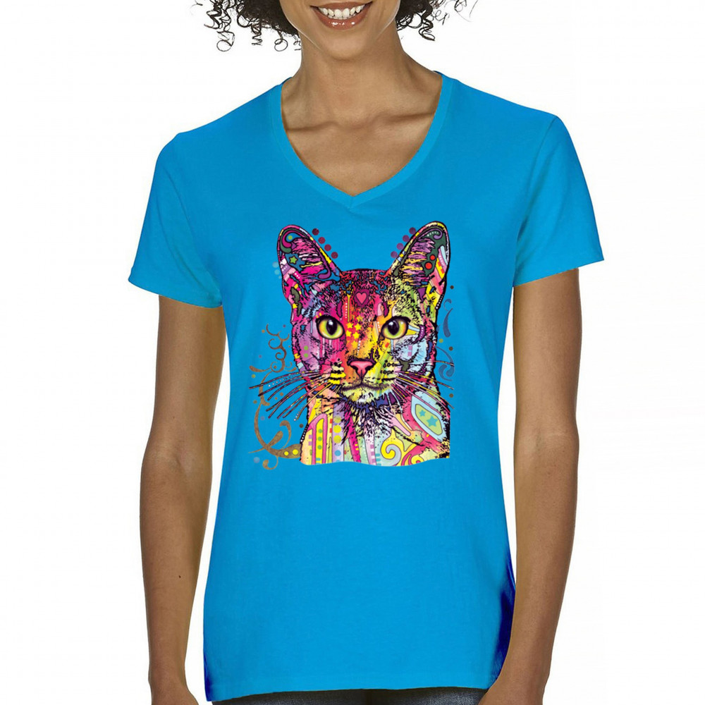DEAN RUSSO ABYSSINIAN CAT women's v-neck t-shirt colorful cute kitten pet tee turquoise