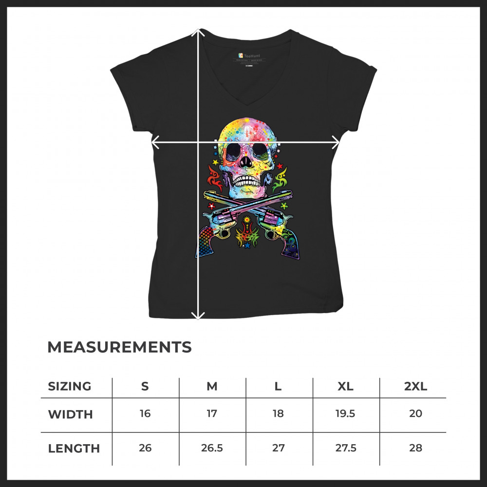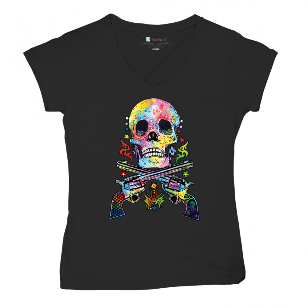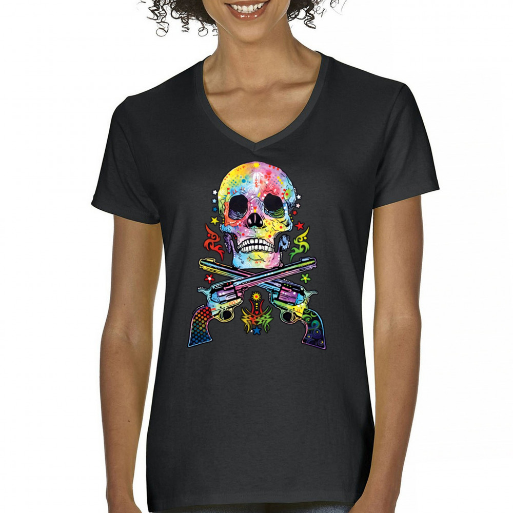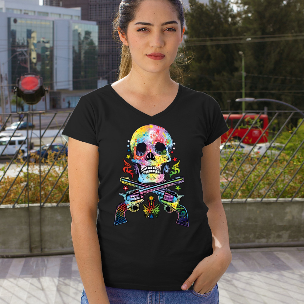 DEAN RUSSO ART SKULL AND GUNS women's v-neck t-shirt colorful 2nd amendment tee black