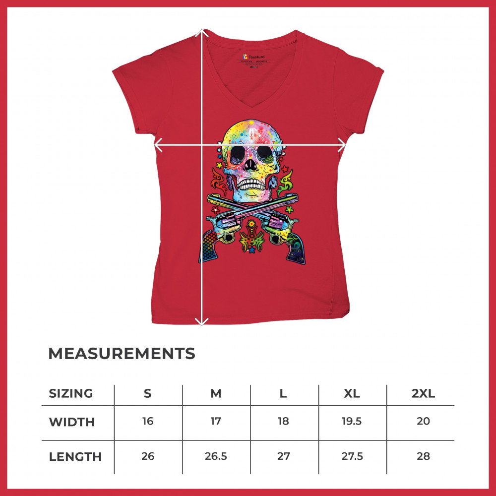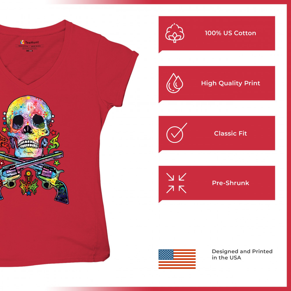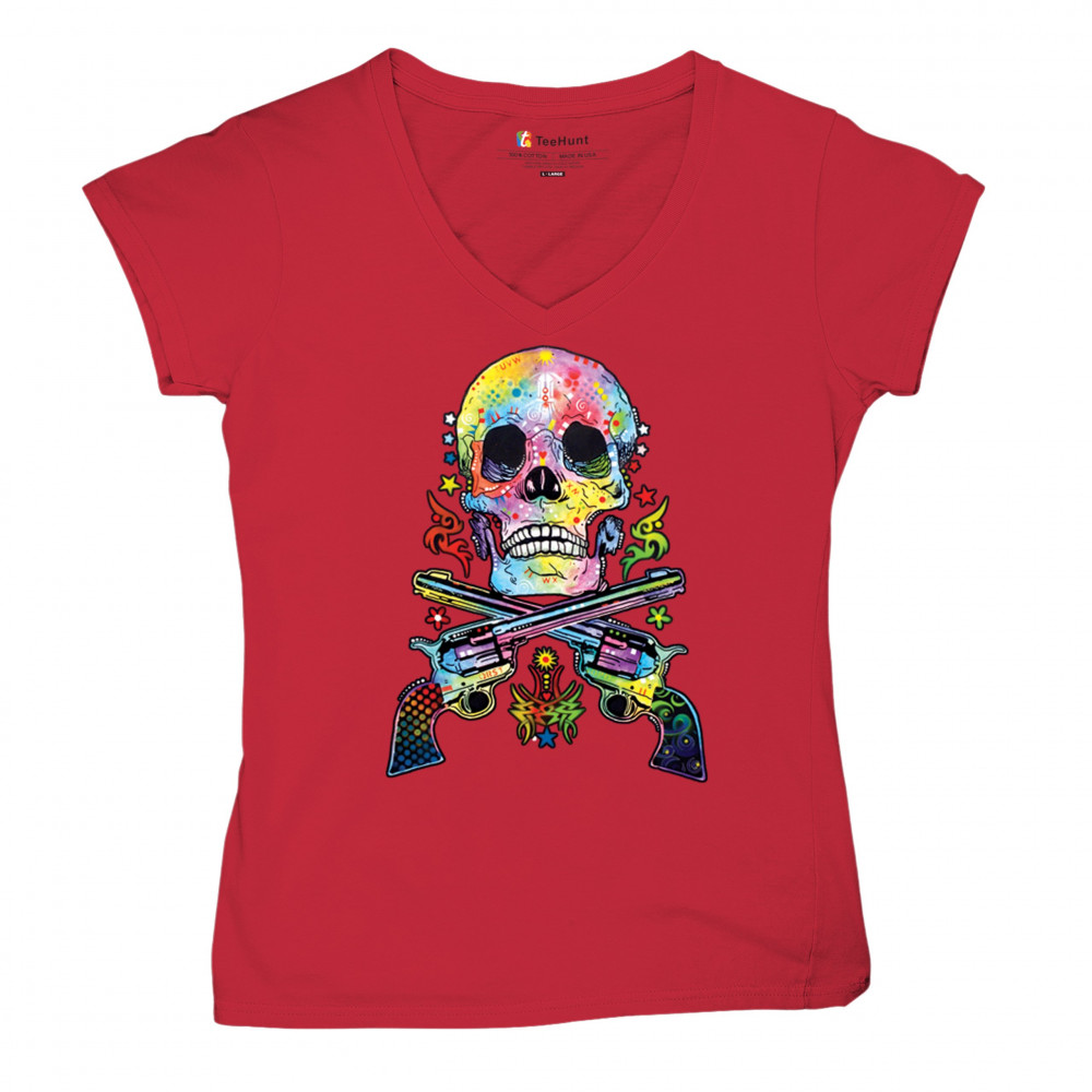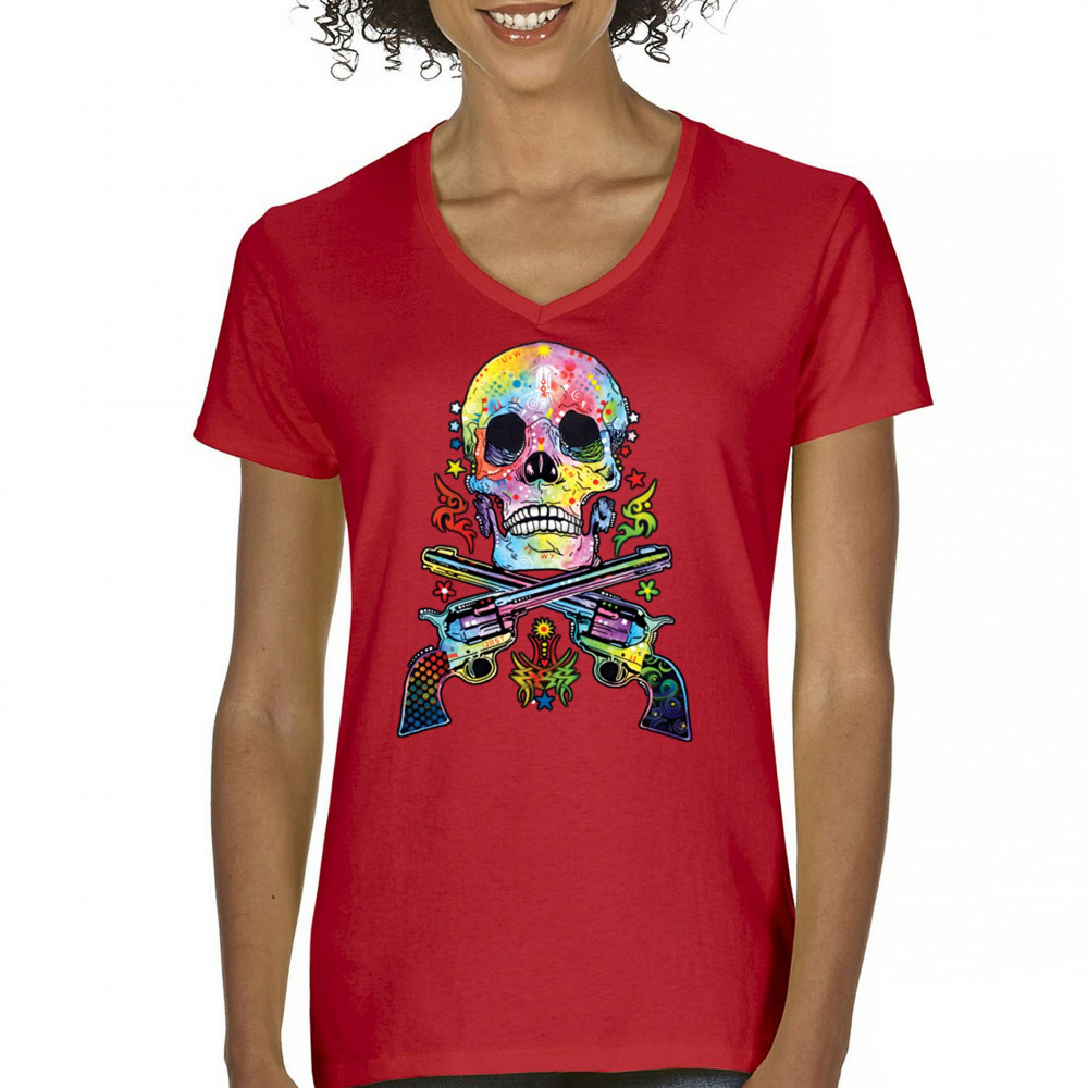DEAN RUSSO ART SKULL AND GUNS women's v-neck t-shirt colorful 2nd amendment tee red