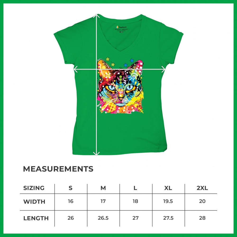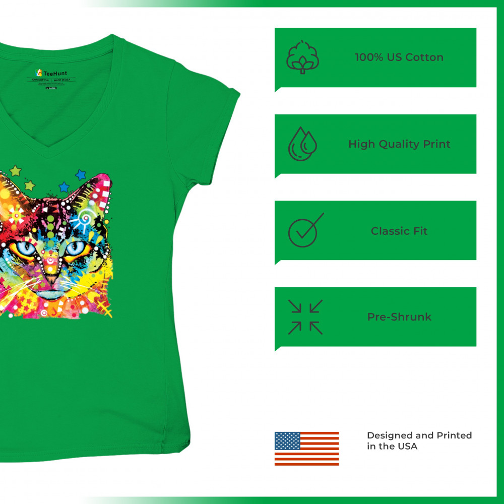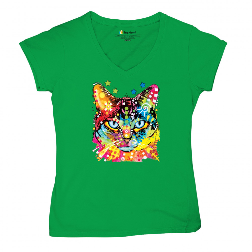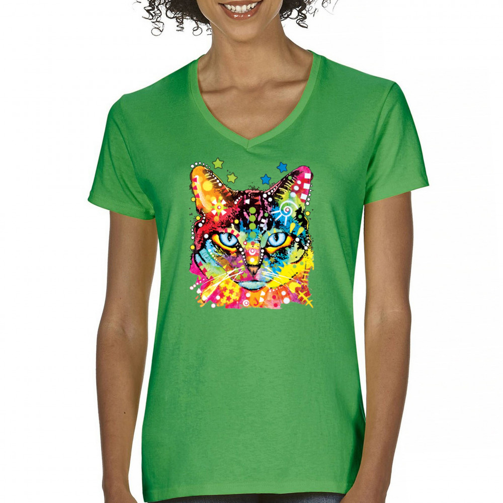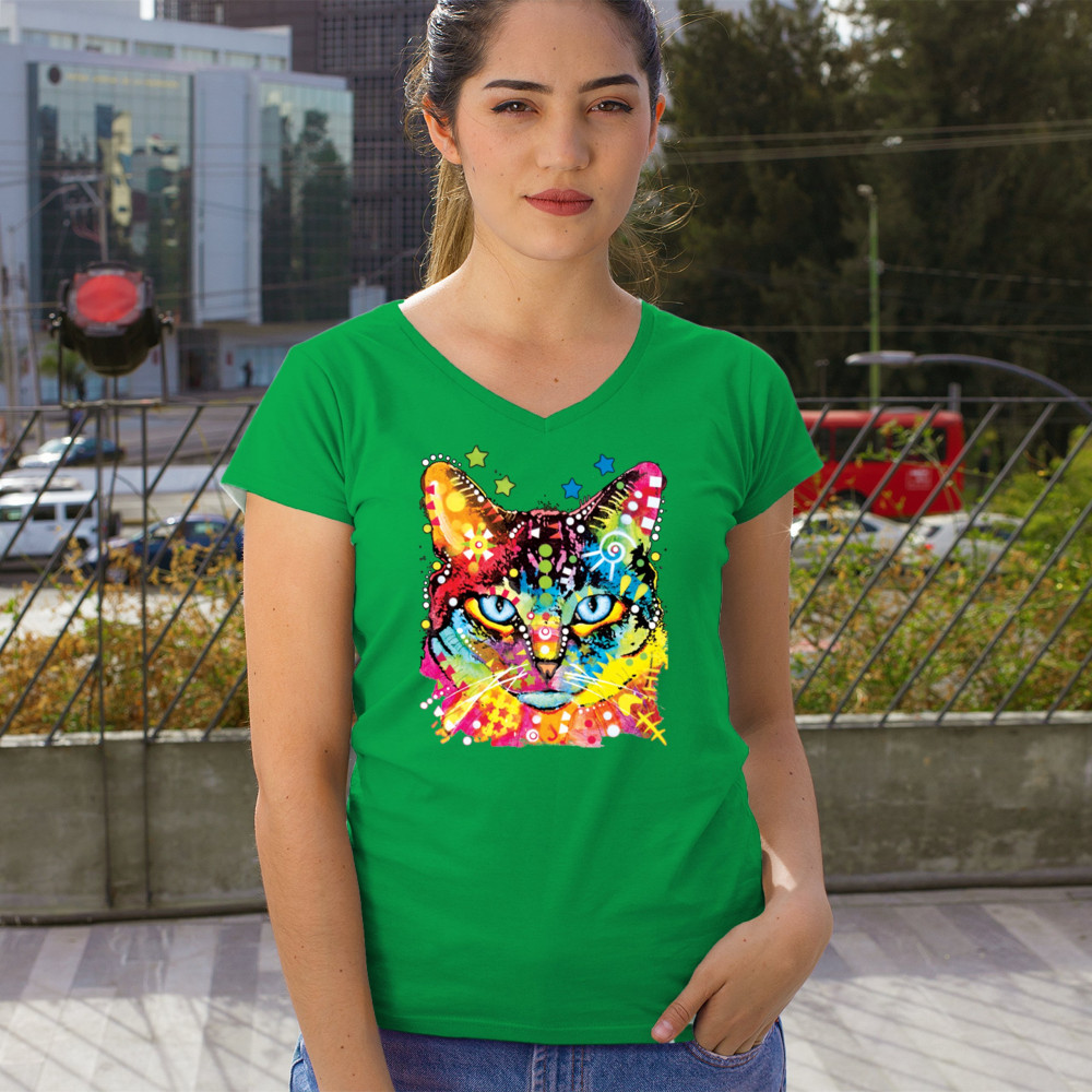 DEAN RUSSO BLUE EYES CAT women's v-neck t-shirt colorful cute kitten pet tee green