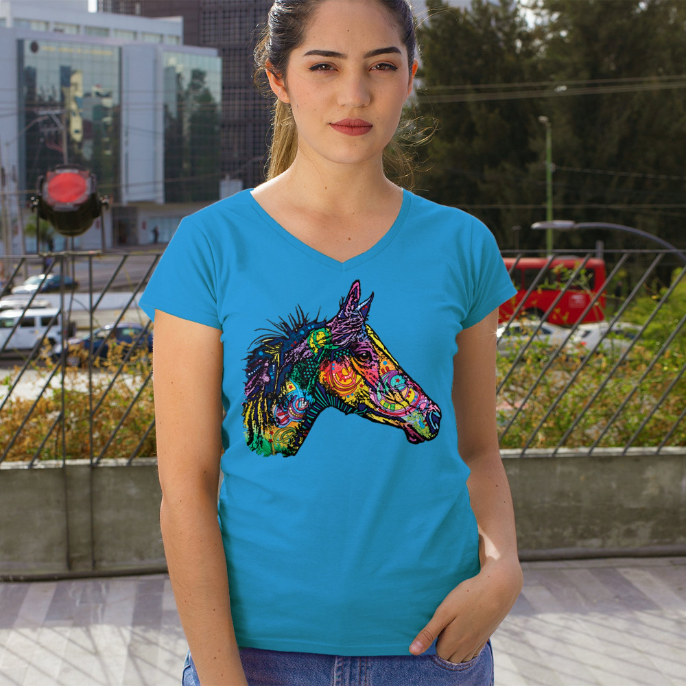 DEAN RUSSO COLORFUL HORSE women's v-neck t-shirt neon mosaic wild mustang tee turquoise