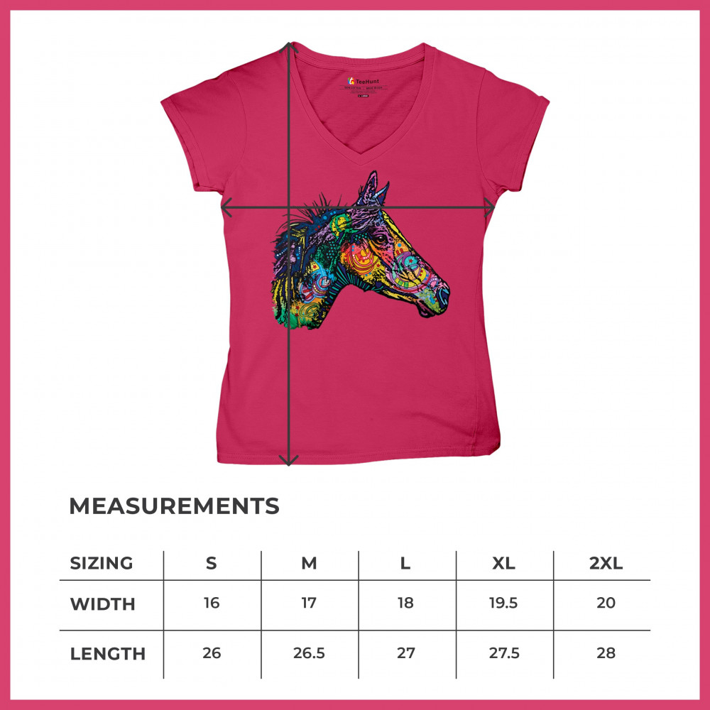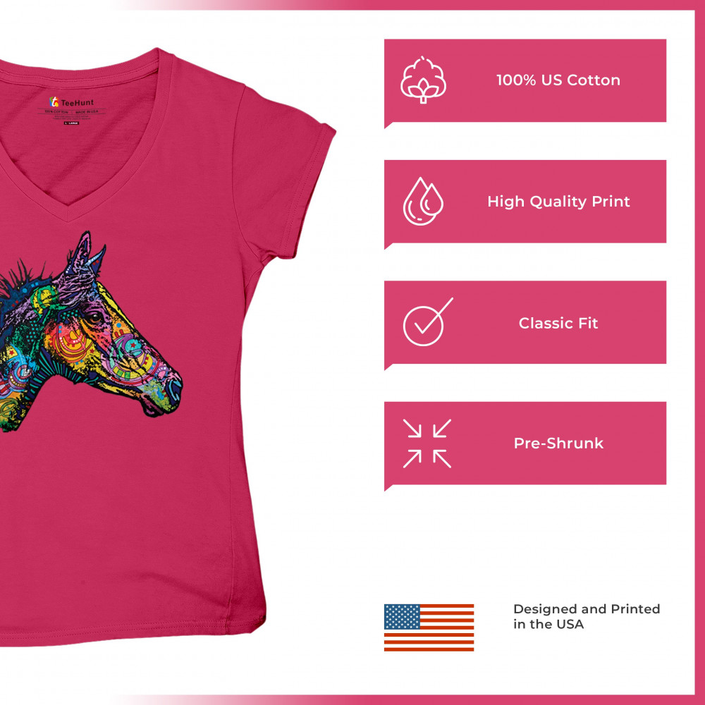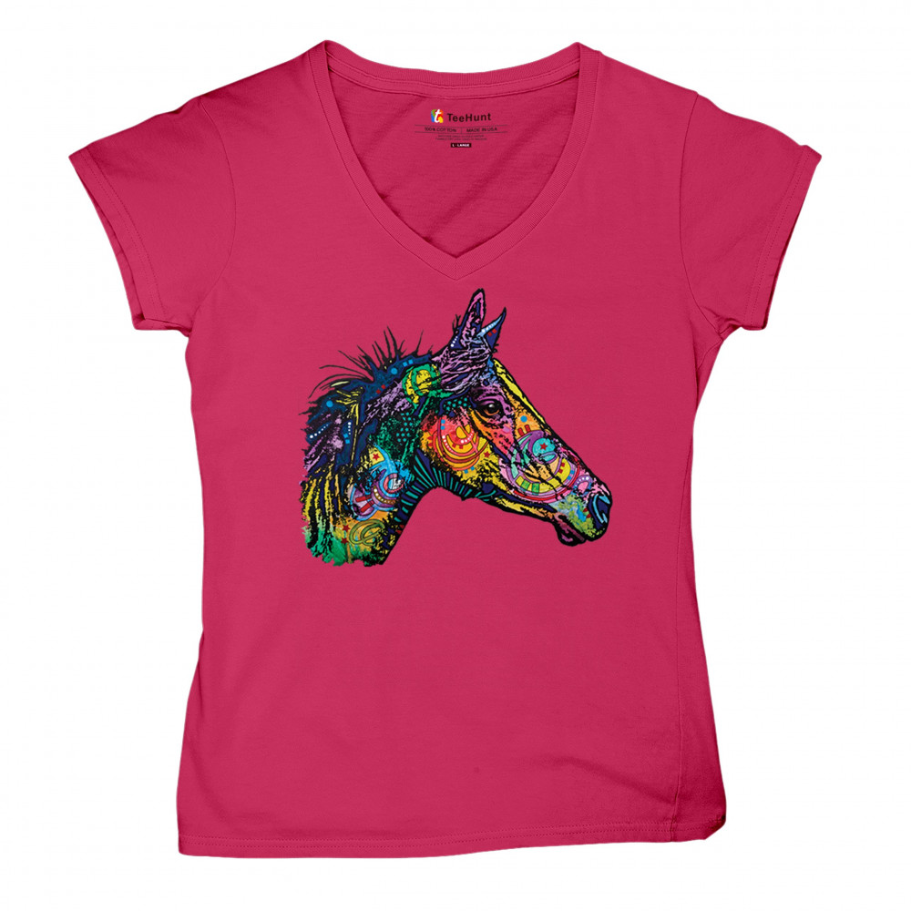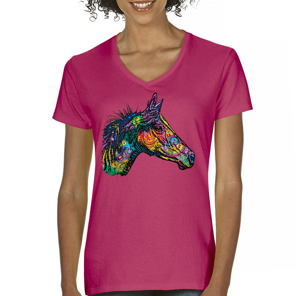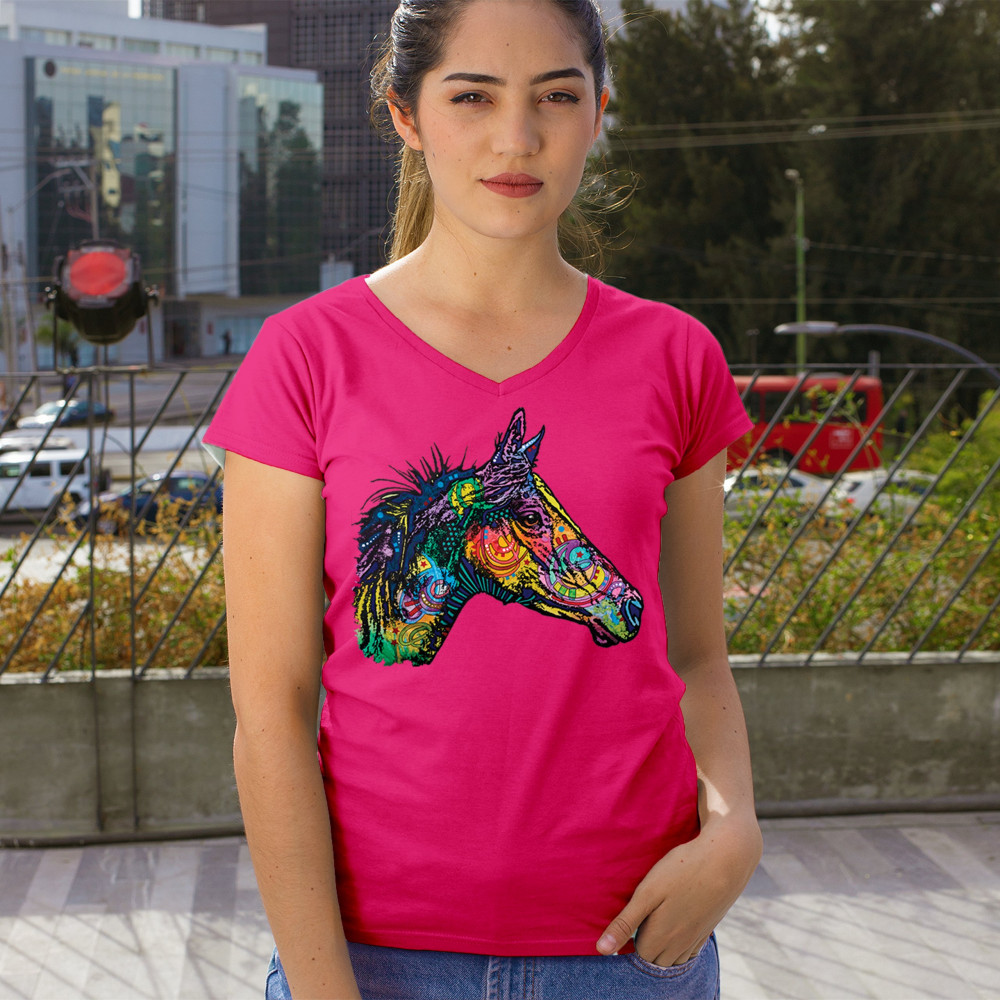 DEAN RUSSO COLORFUL HORSE women's v-neck t-shirt neon mosaic wild mustang tee pink