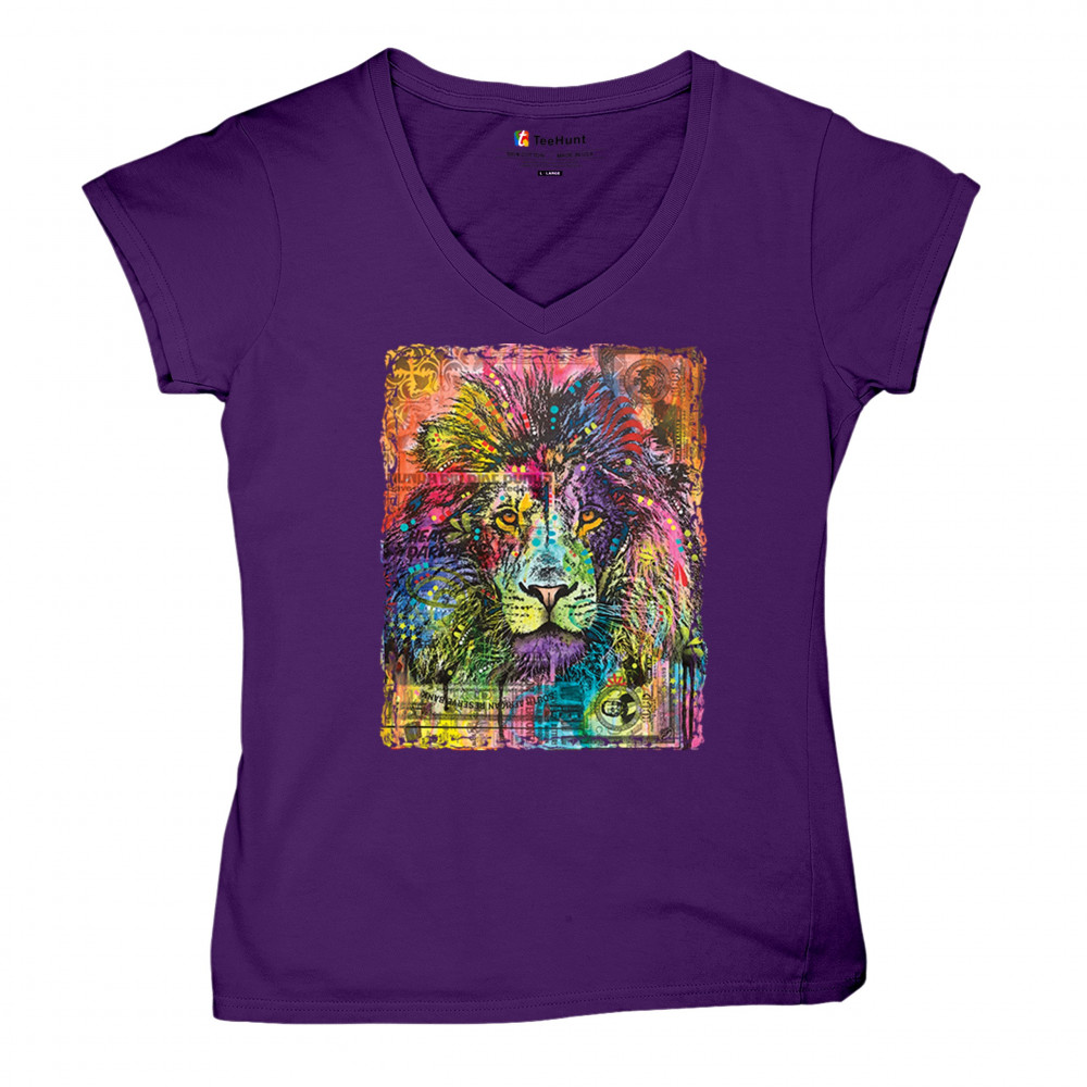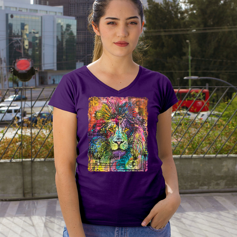 DEAN RUSSO COLORFUL LION HEAD women's v-neck t-shirt wild life king roar tee purple