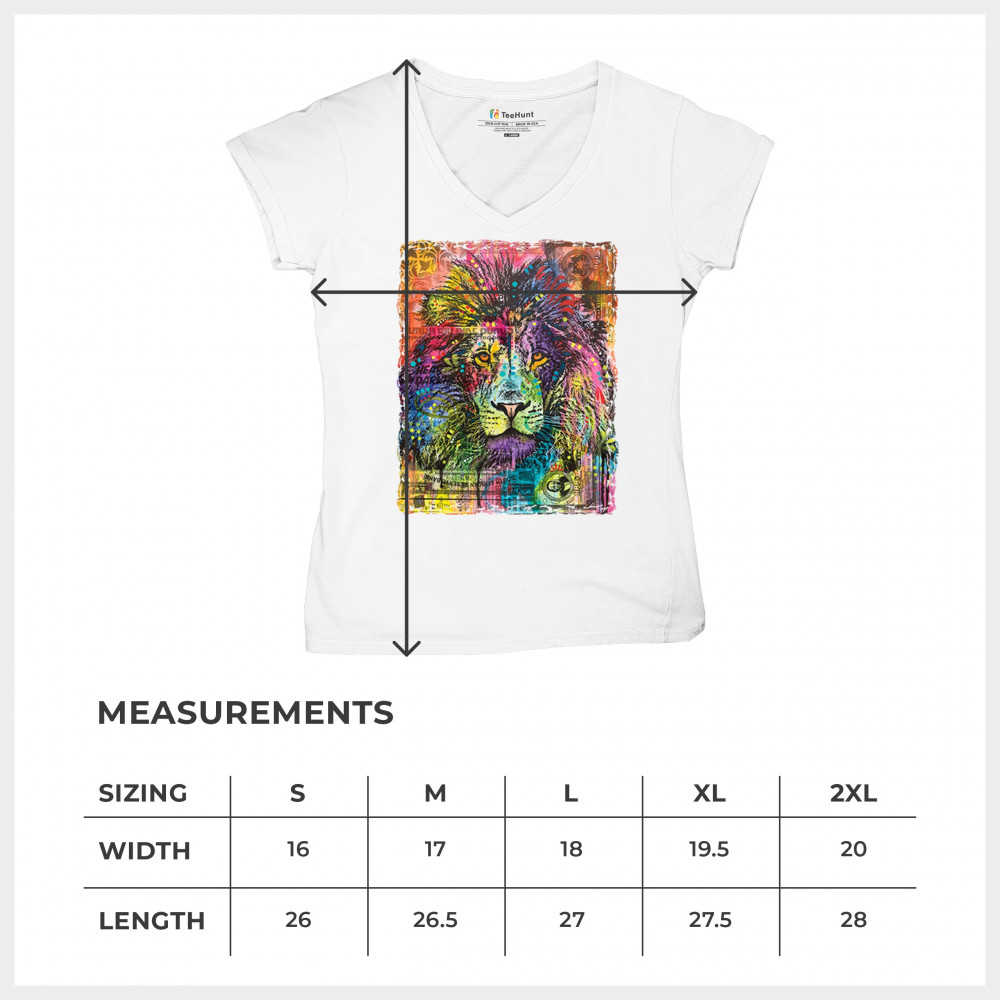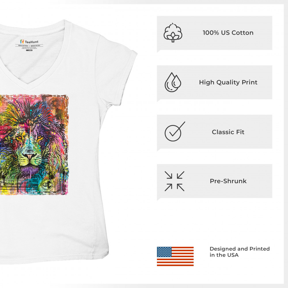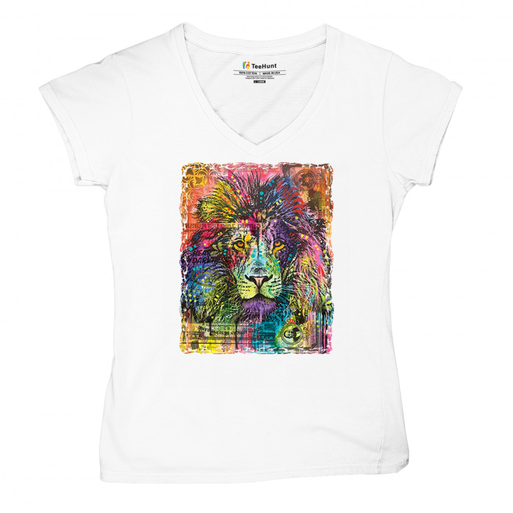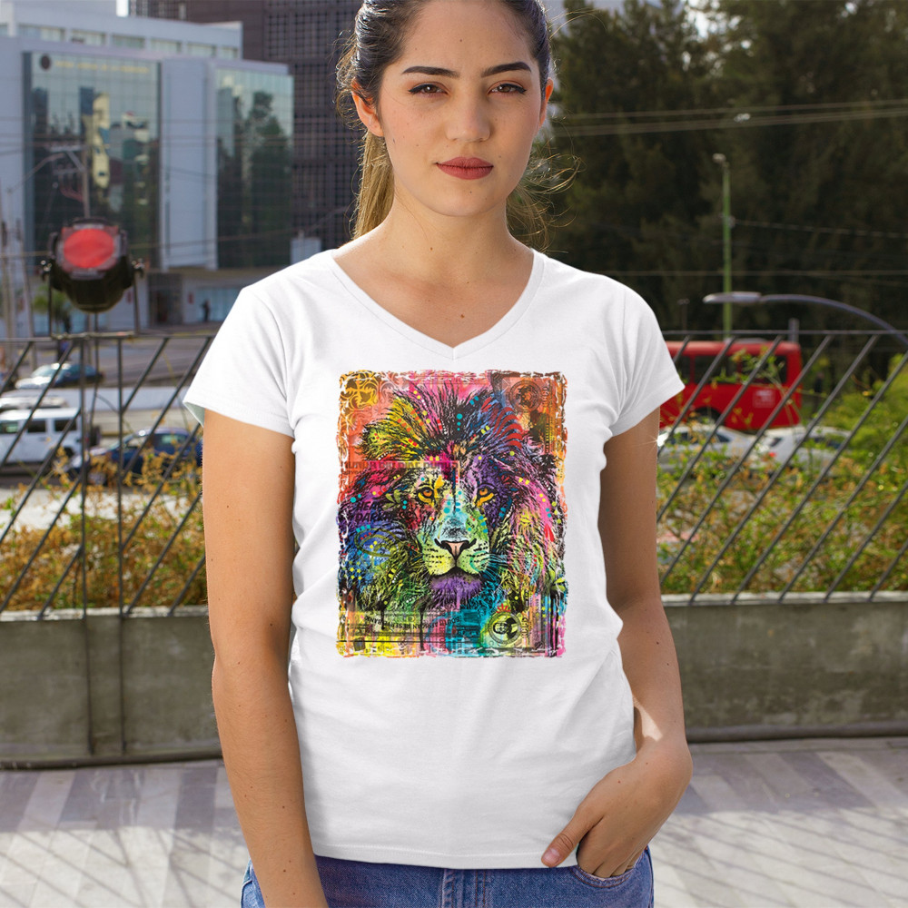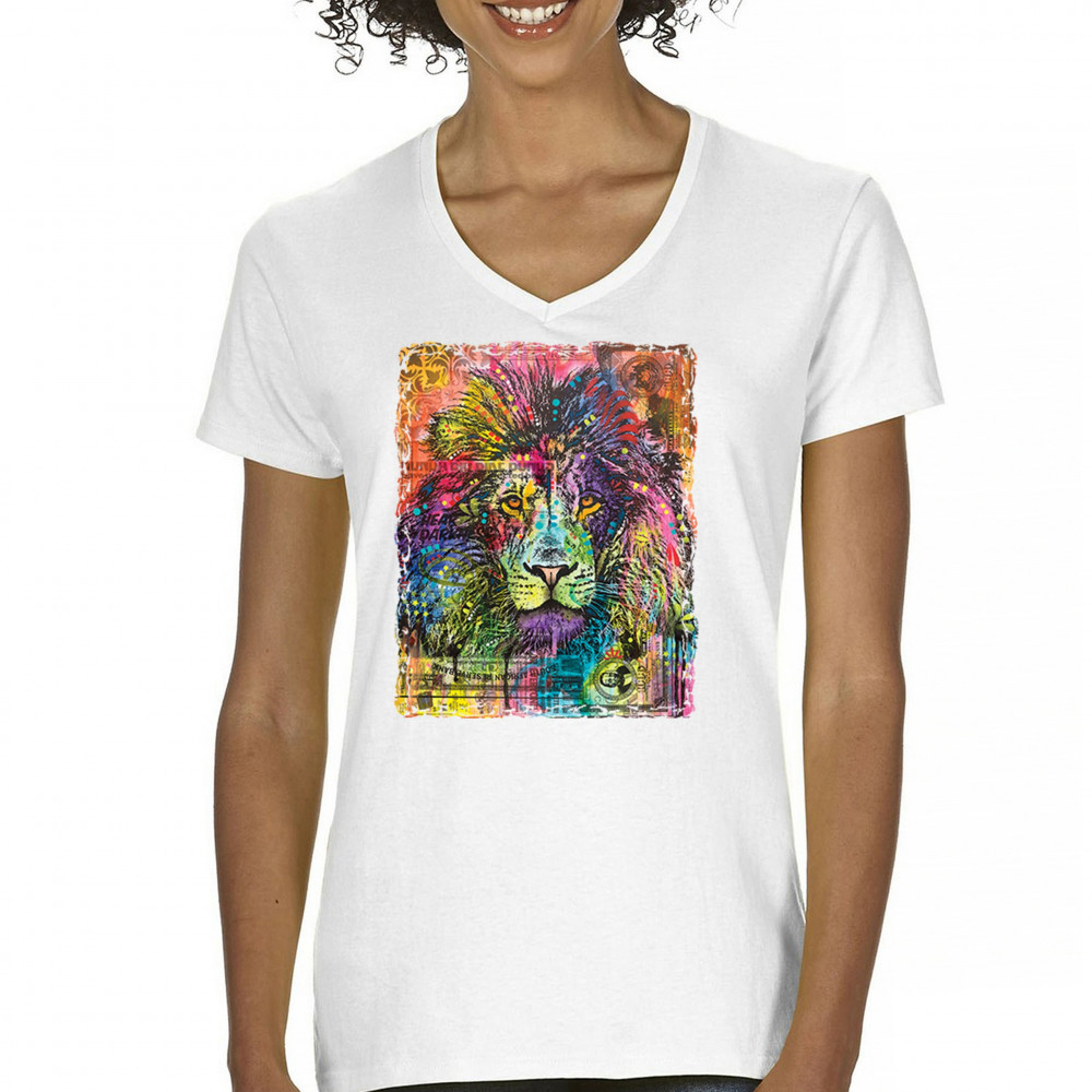 DEAN RUSSO COLORFUL LION HEAD women's v-neck t-shirt wild life king roar tee white