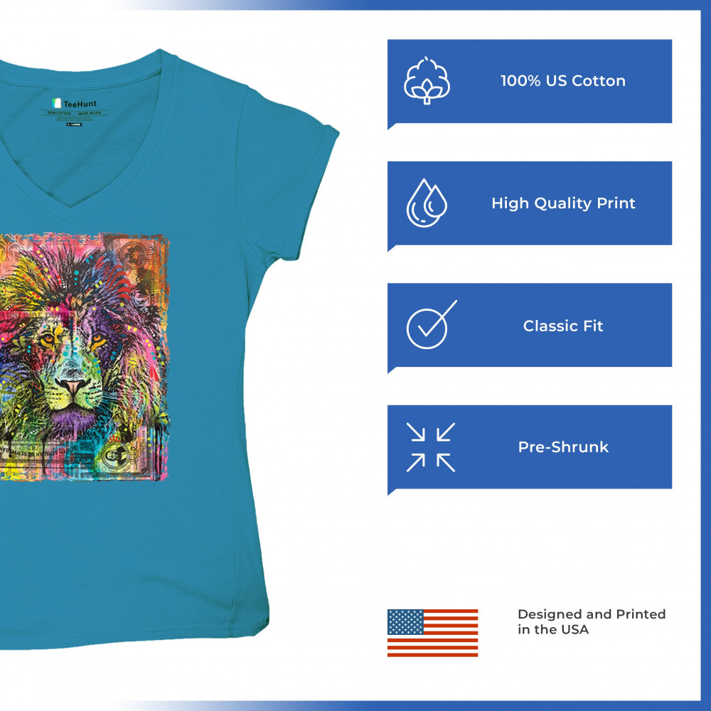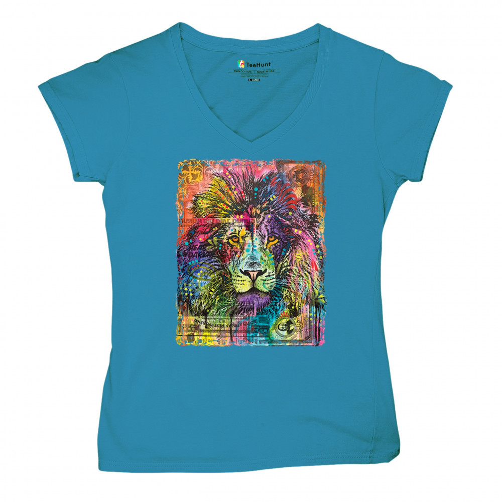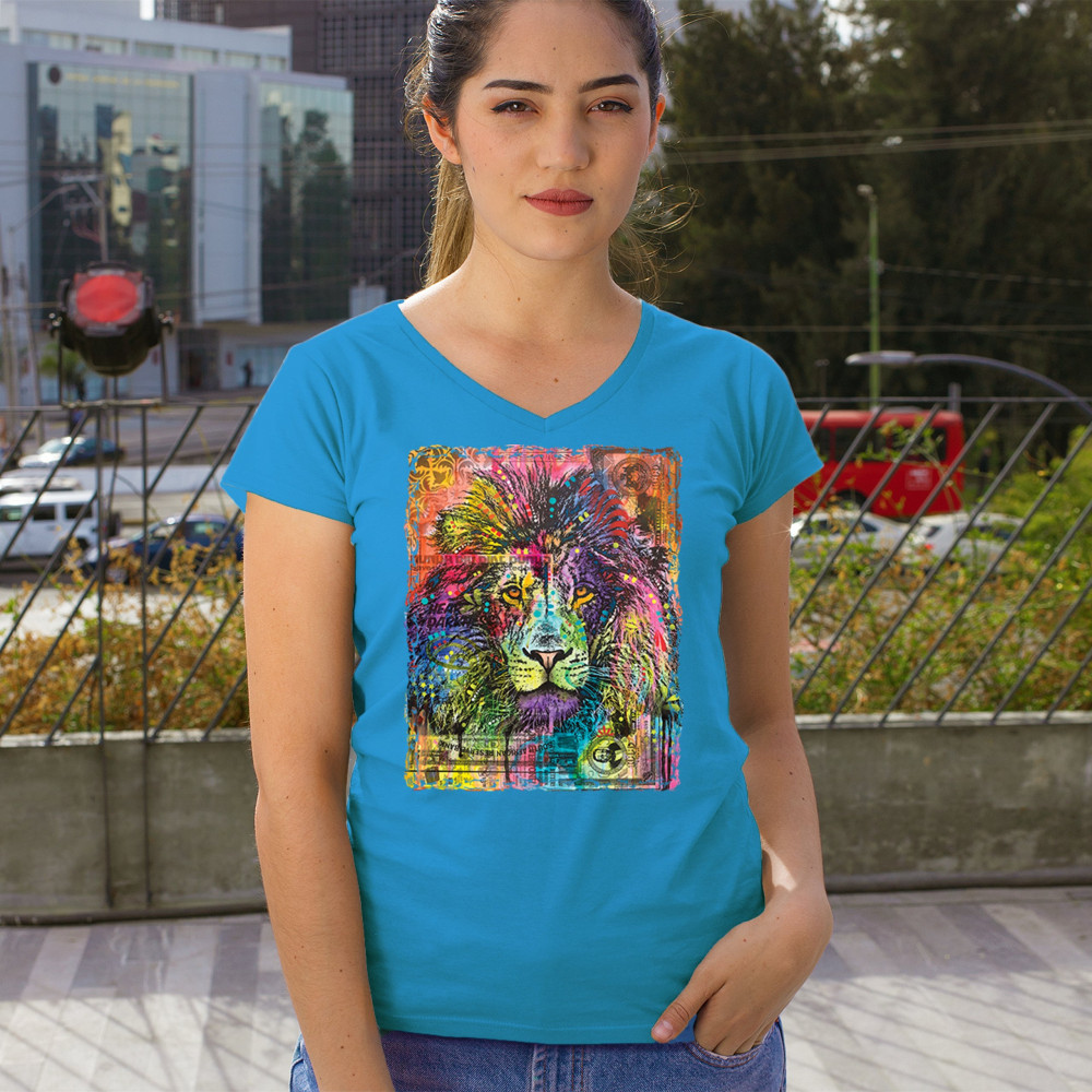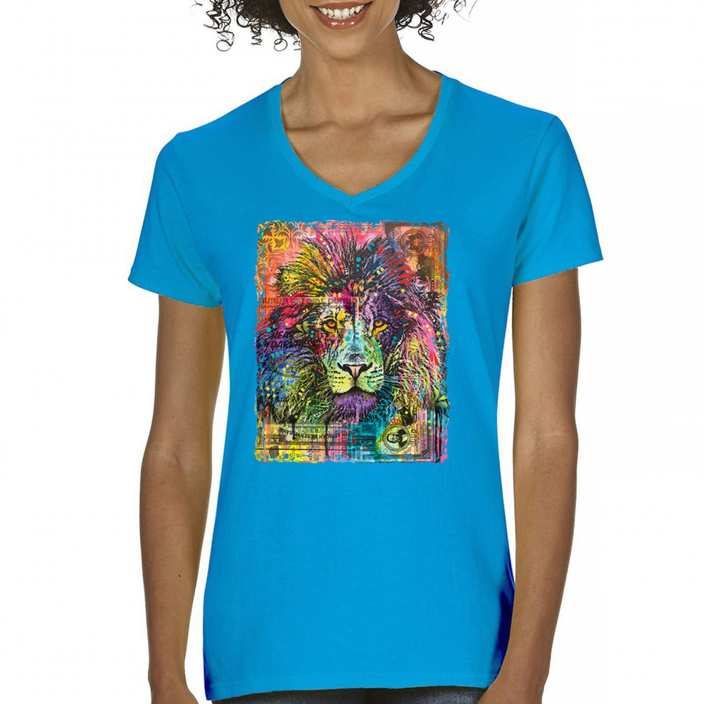 DEAN RUSSO COLORFUL LION HEAD women's v-neck t-shirt wild life king roar tee turquoise