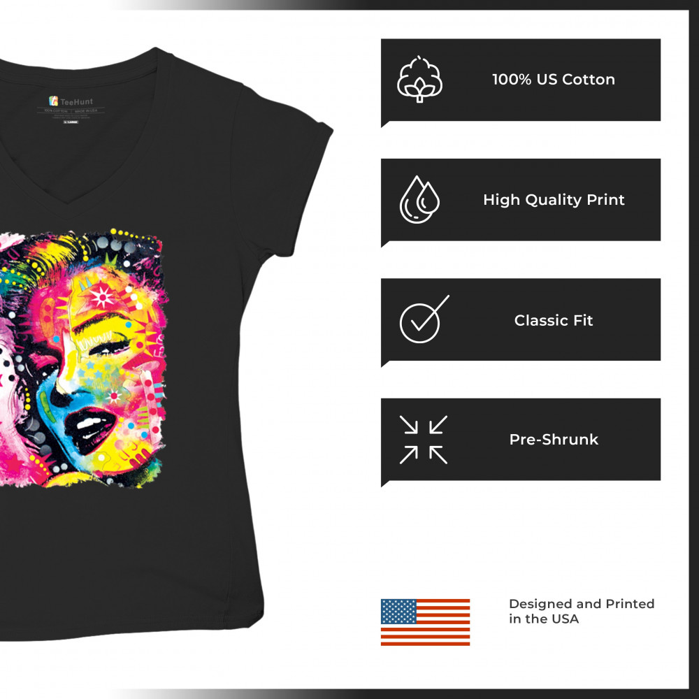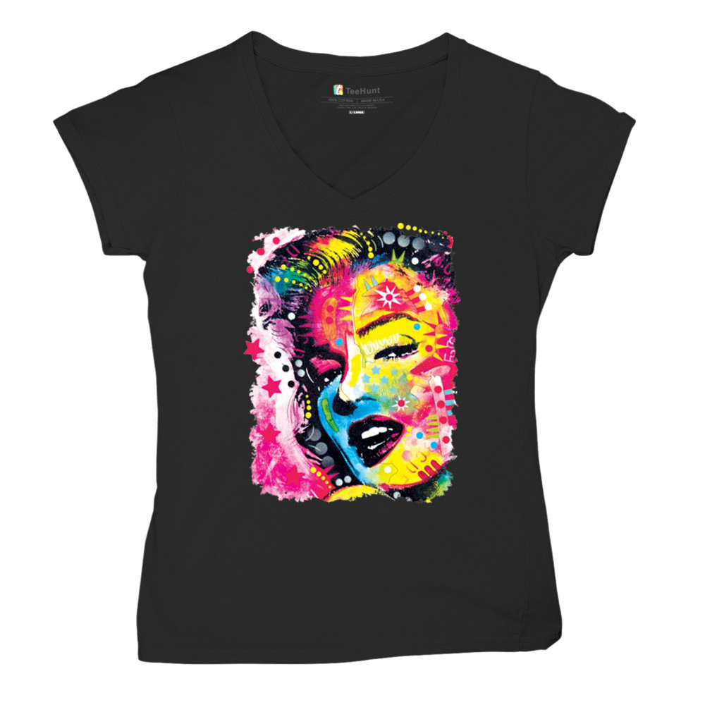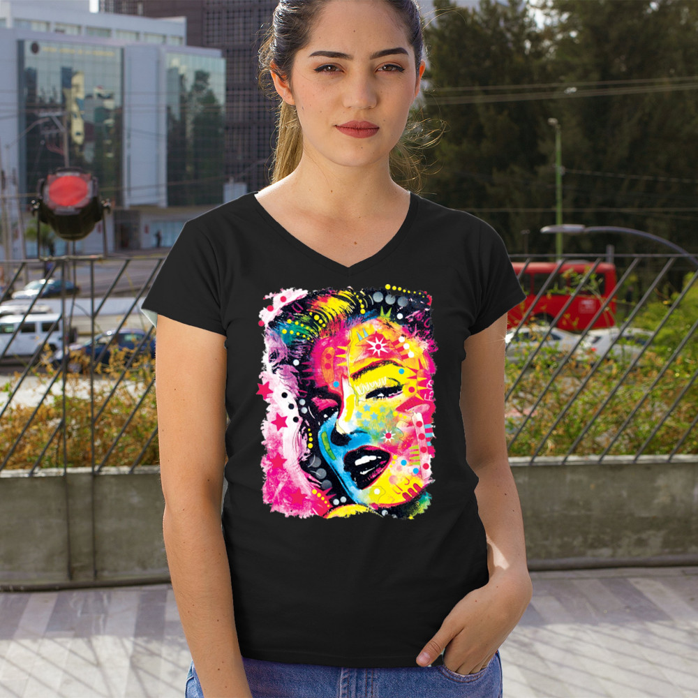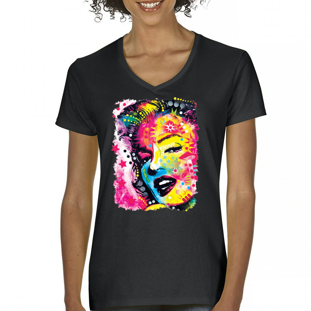 DEAN RUSSO COLORFUL MARILYN women's v-neck t-shirt neon hot symbol starlet tee black
