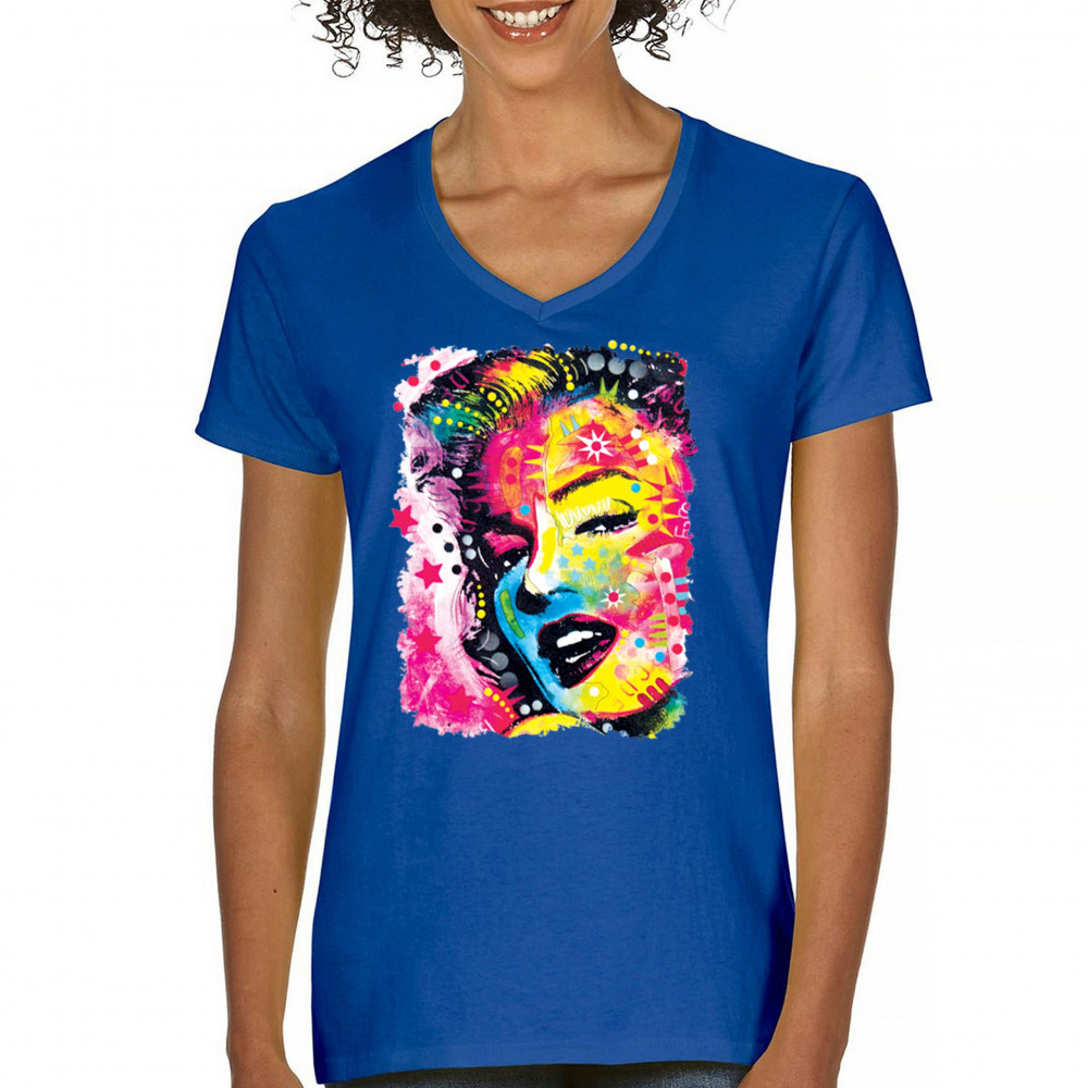 DEAN RUSSO COLORFUL MARILYN women's v-neck t-shirt neon hot symbol starlet tee royal blue