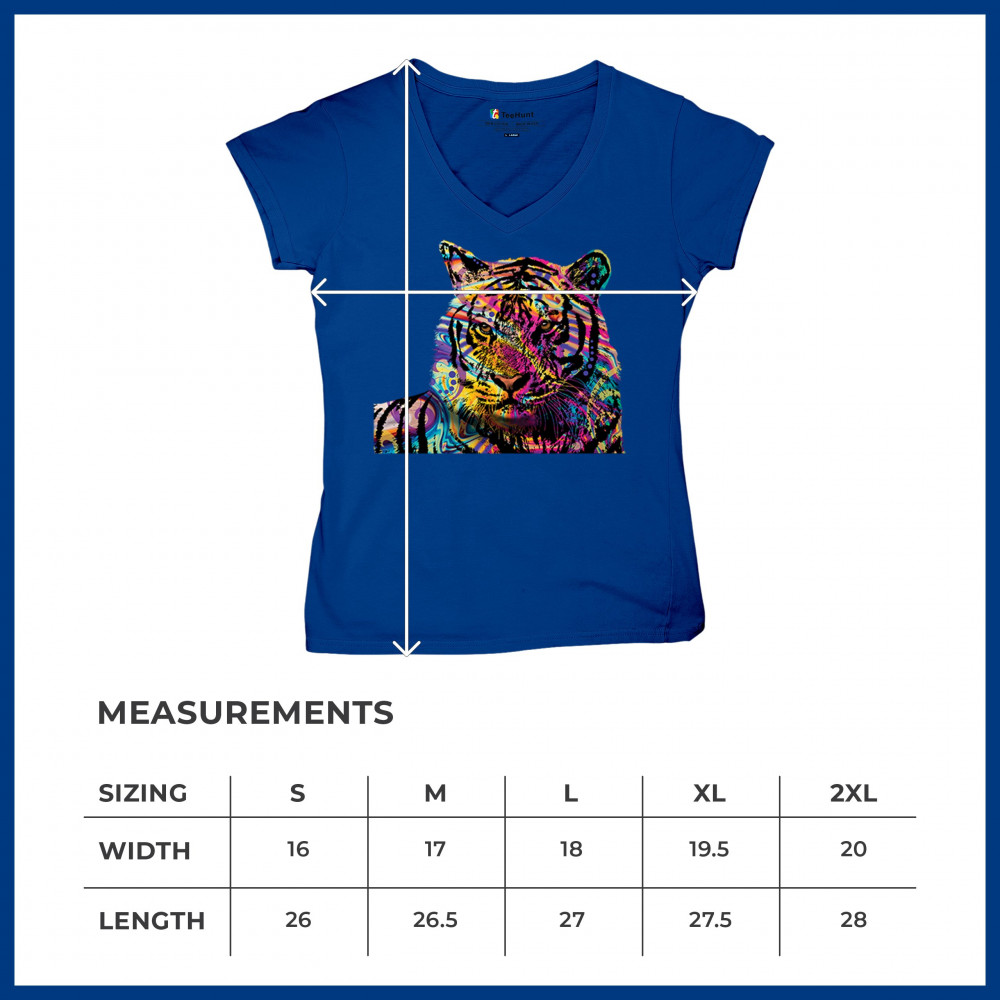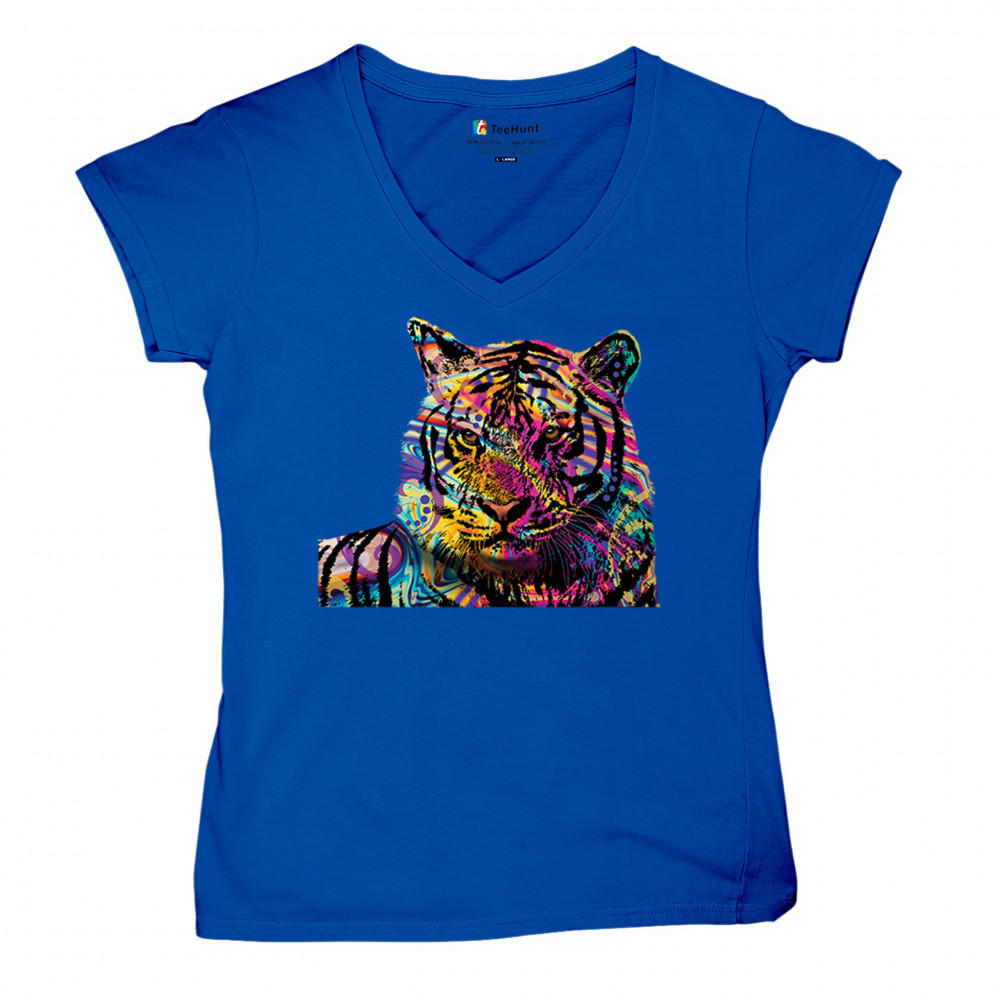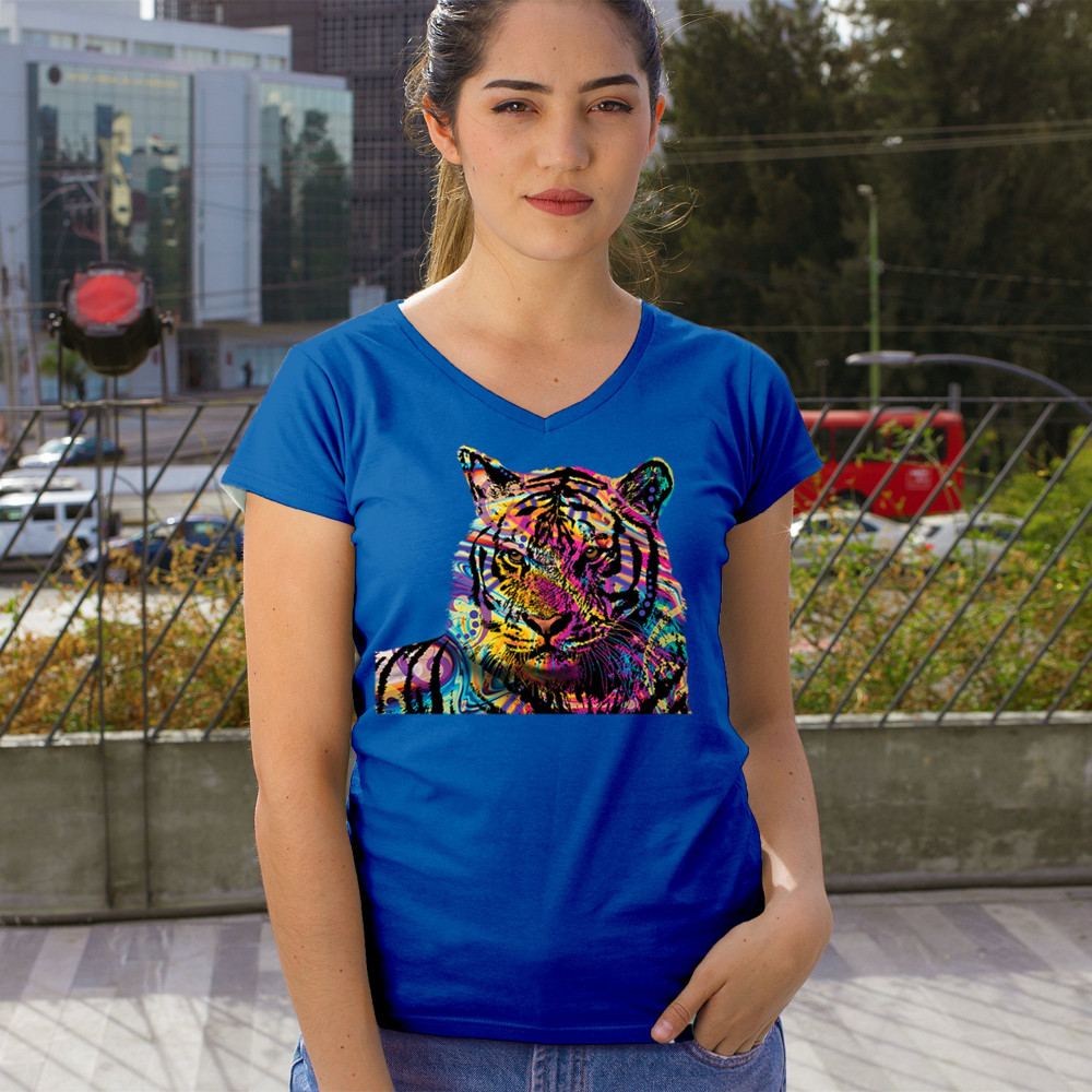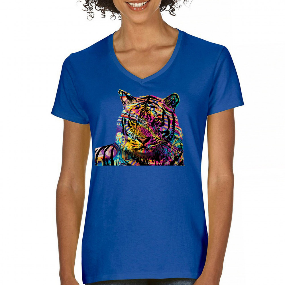 DEAN RUSSO COLORFUL NEON SIBERIAN TIGER women's v-neck t-shirt wild big cat tee royal blue