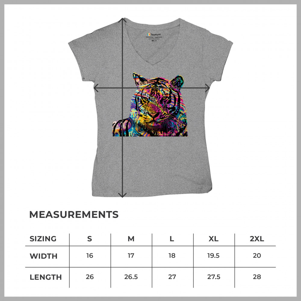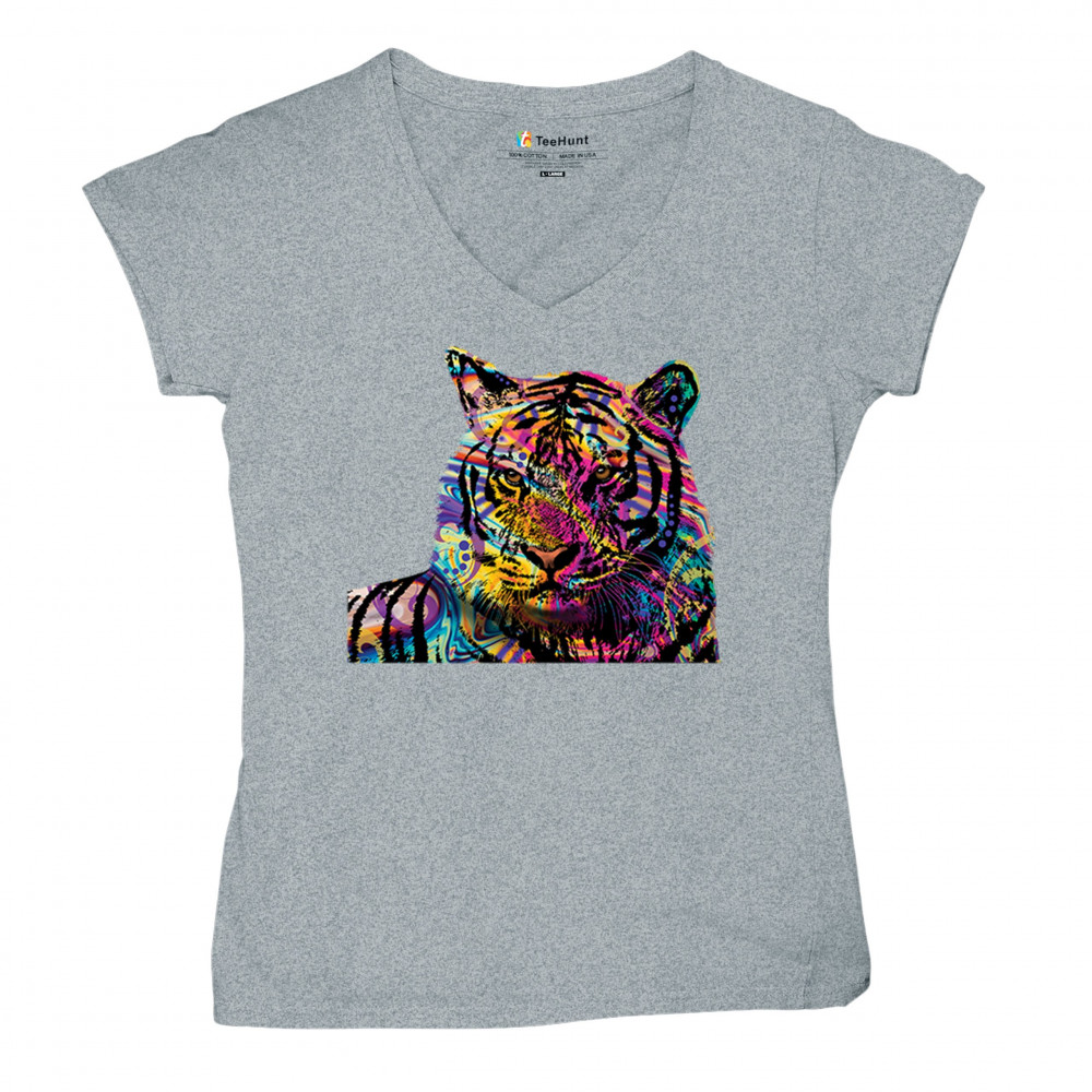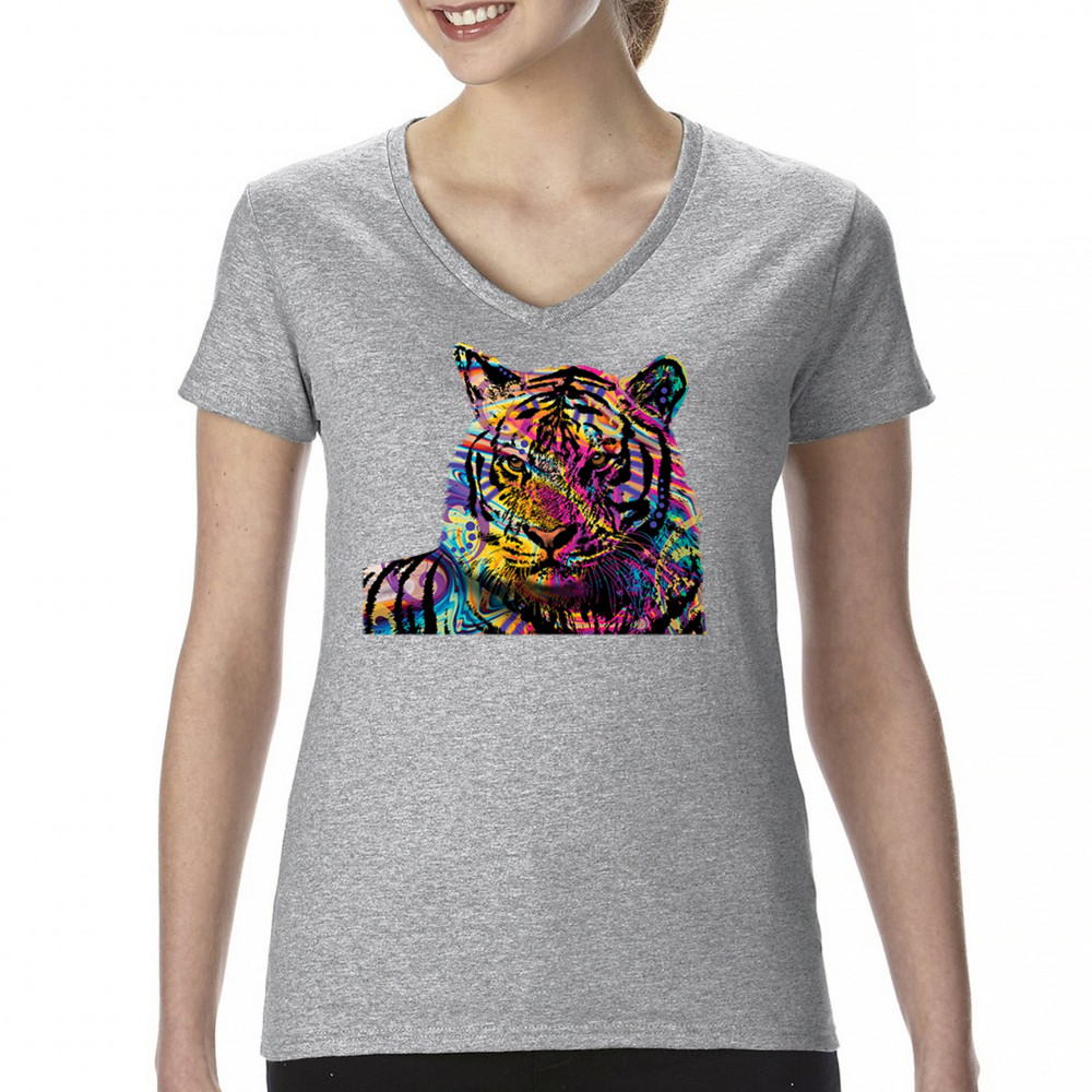 DEAN RUSSO COLORFUL NEON SIBERIAN TIGER women's v-neck t-shirt wild big cat tee gray